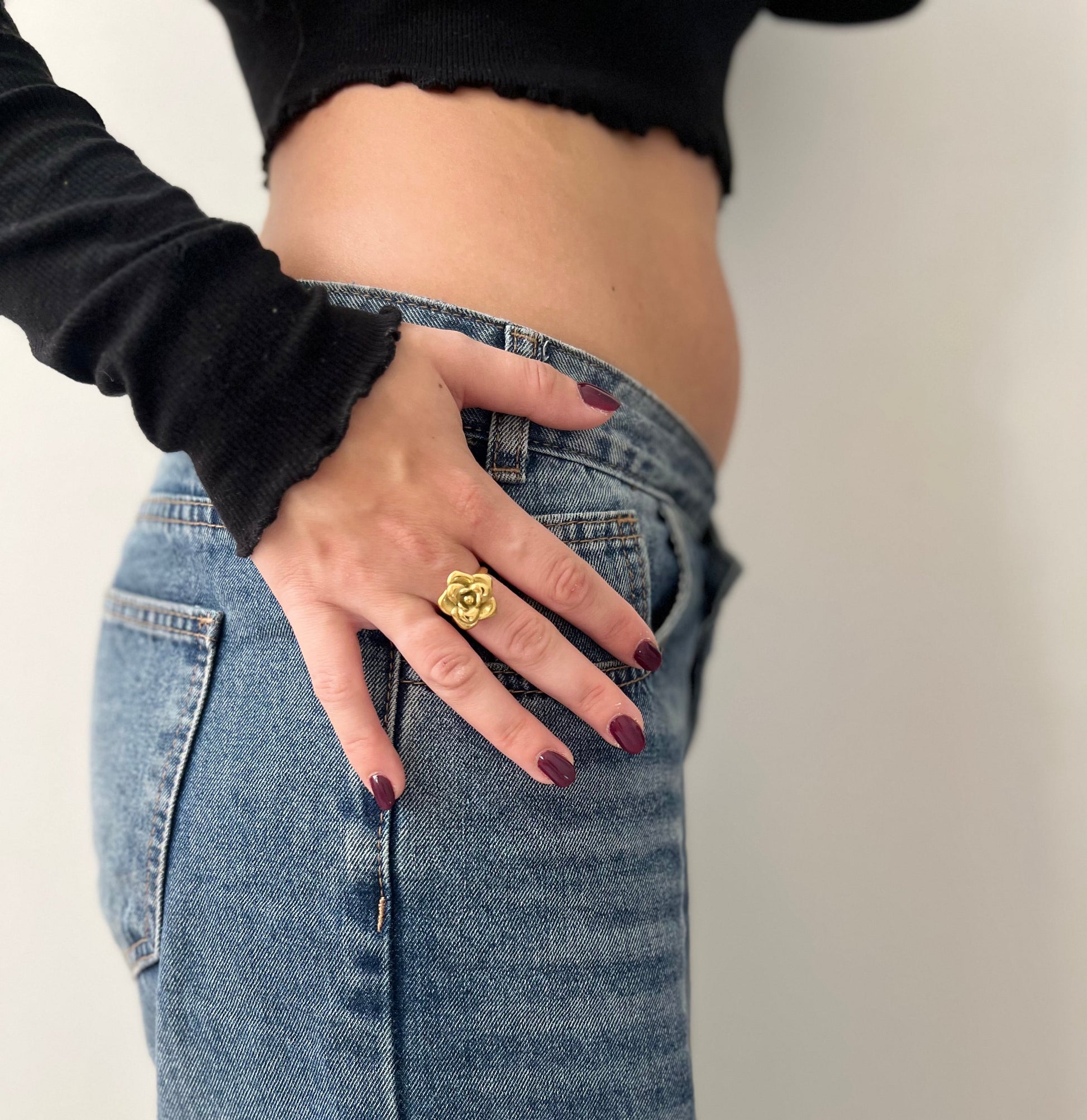 Fiore Dorato" è un anello raffinato e delicato, realizzato in acciaio inossidabile con elegante finitura dorata. Il suo charm floreale lo rende un simbolo di rinascita, bellezza e femminilità.