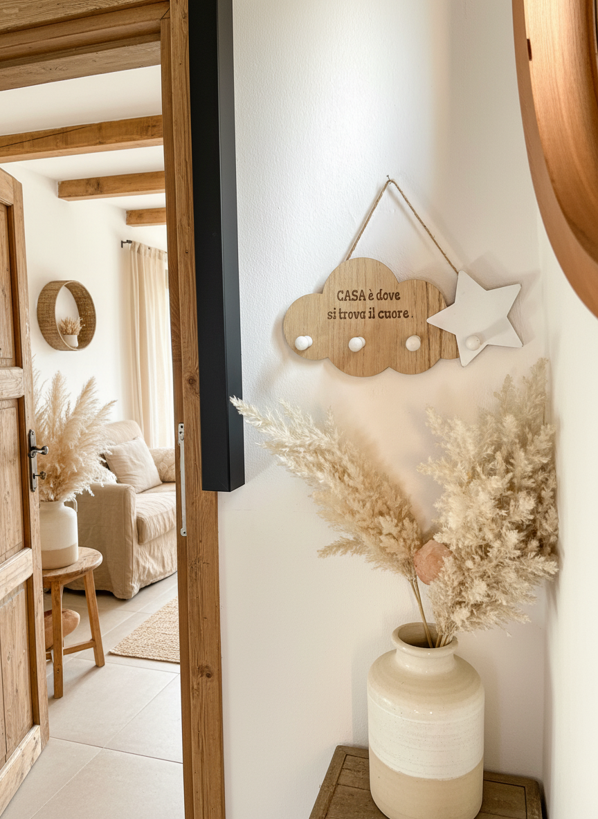 Appendi chiavi in legno con dettaglio stella bianca e la frase incisa "Casa dove si trova il cuore".