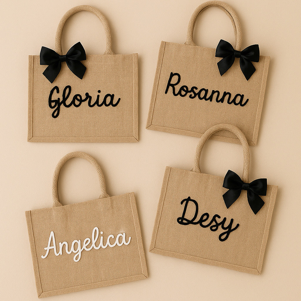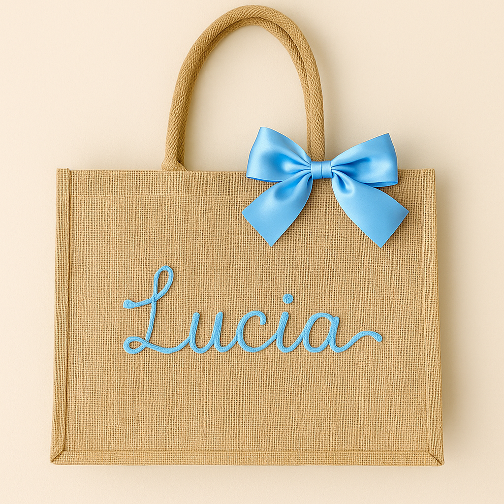 Elegante, capiente e realizzata in juta naturale, questa borsa è impreziosita da un fiocco in raso e dal nome realizzato in morbido filato tricotin. Perfetta per il mare, le vacanze o come idea regalo unica e originale.