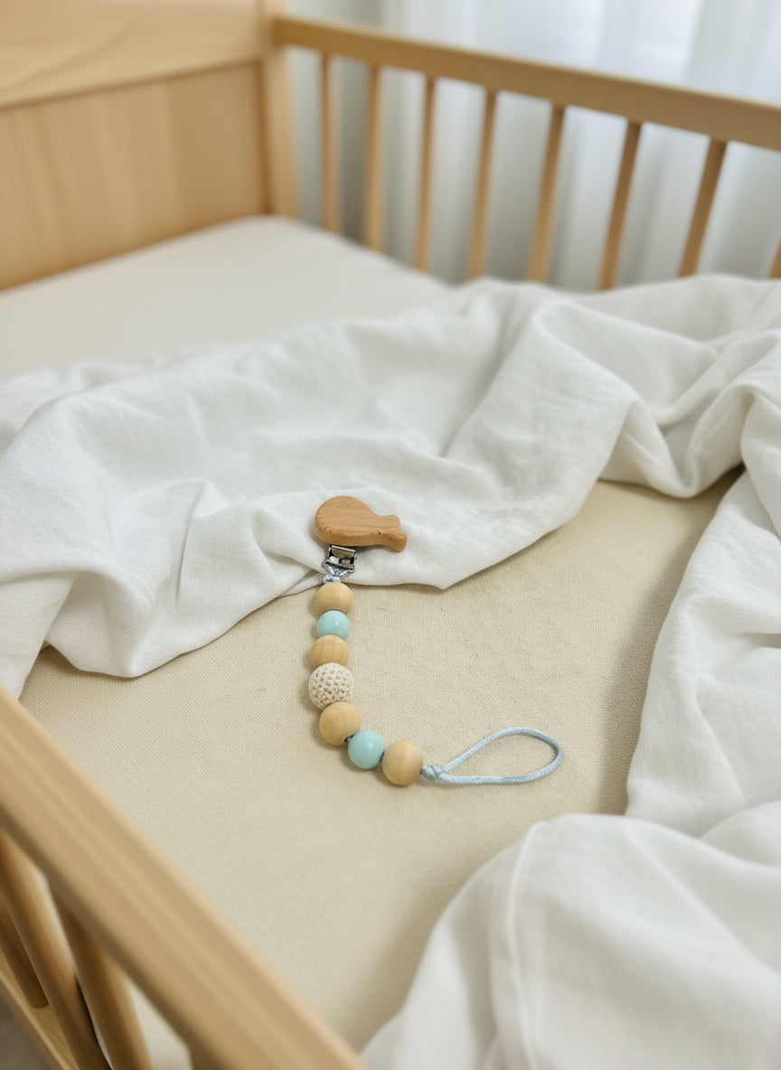 Catenella portaciuccio Balena , realizzata con perline in legno e uncinetto dai colori neutri. Incisione del nome della bimba su clip a form a di Balena .