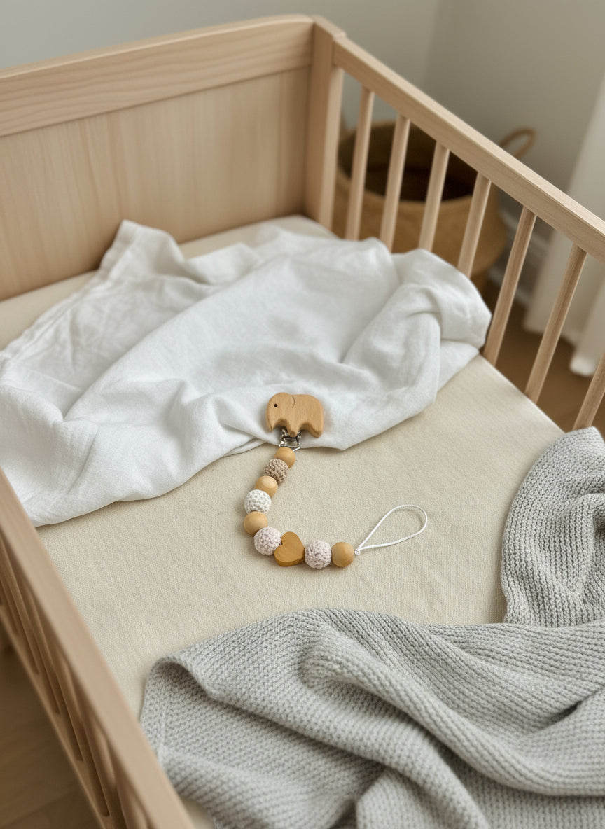 Catenella portaciuccio tema elefantino , realizzata con perline in legno e uncinetto dai colori neutri. Incisione del nome della bimba su clip a form a di elefantino .