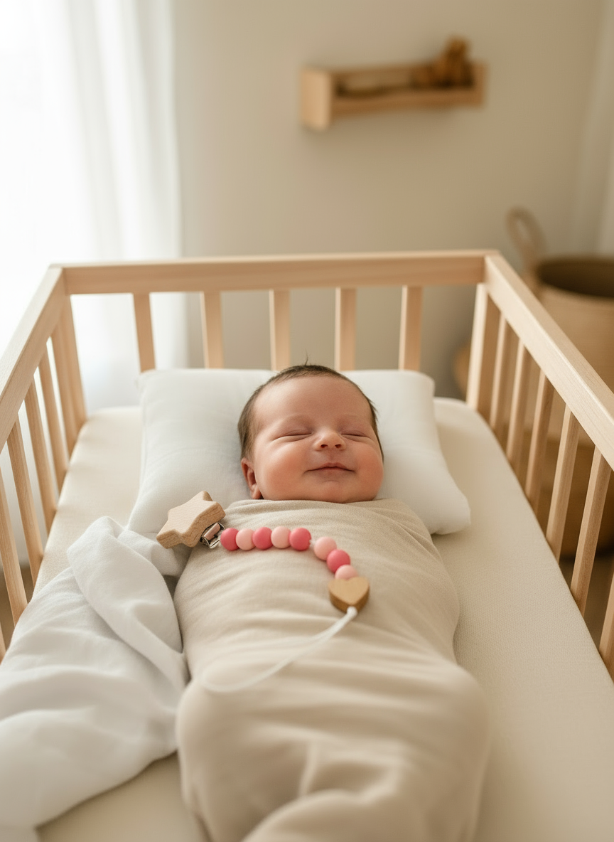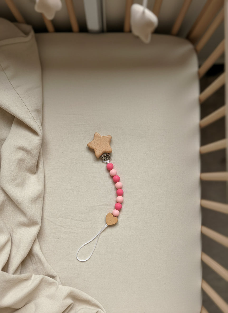 Catenella portaciuccio "Stella" con incisione nome si clip a forma di stella : un accessorio pratico per il tuo bambino. Realizzata con perline in silicone di alta qualità, sicure e morbide, la catenella è dotata di una clip in legno a forma di stella per attaccare facilmente il ciuccio al vestito del piccolo. (Compreso packaging regalo)
