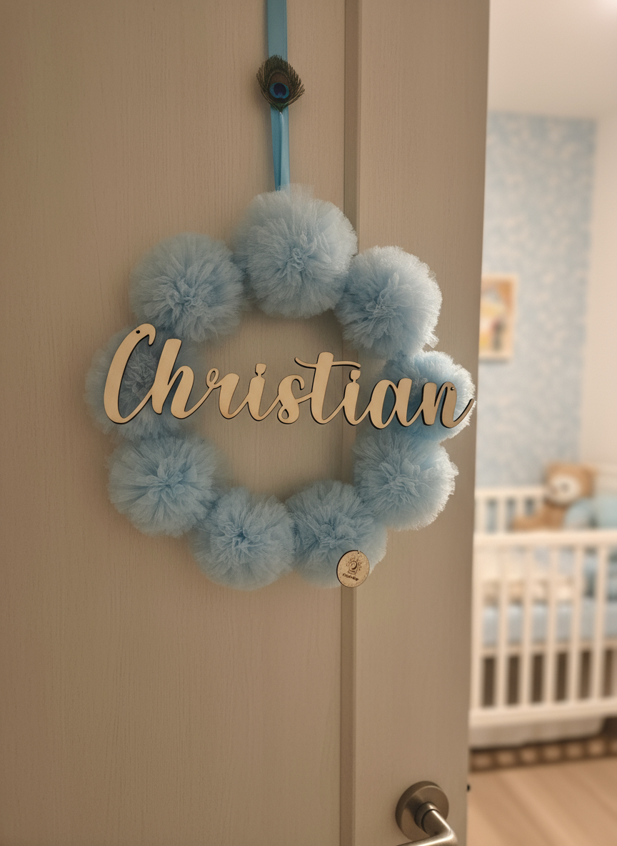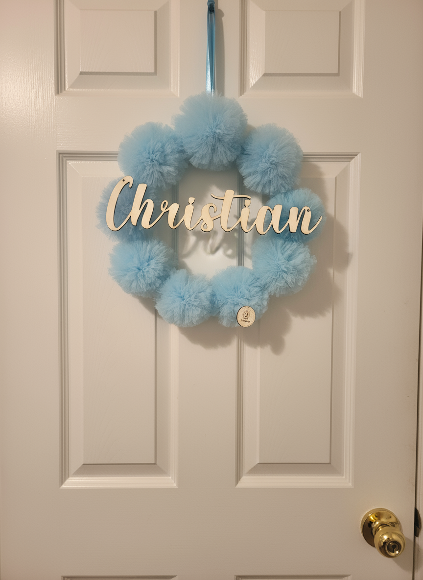 Cerchio nascita con pon pon di tulle e nome in legno del nascituro/a, un’idea delicata e personalizzata per celebrare la nascita! Potrai anche scegliere il colore dei pon pon di tulle per rendere ancora più unica questa creazione
