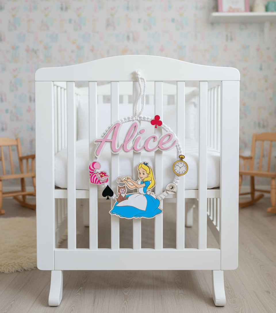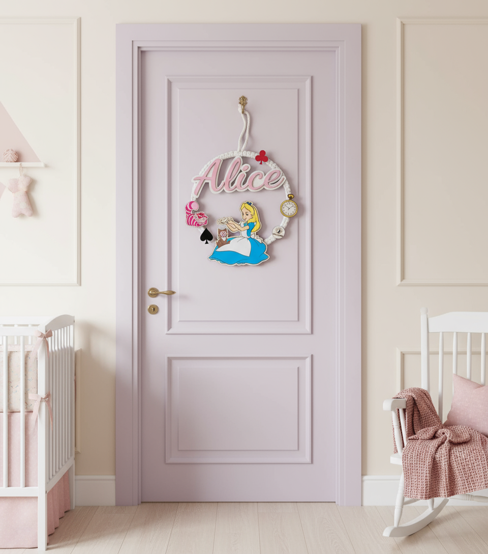 Una creazione artigianale unica e delicata, pensata per celebrare uno dei momenti più belli della vita: la nascita. Realizzato con corde in macramè 100% cotone intrecciate a mano e un tag in legno dipinto con cura nei minimi dettagli, ispirato al magico mondo di Alice in Wonderland, simbolo di sogno, curiosità e meraviglia. Ogni dettaglio racconta una storia: il filo che si intreccia rappresenta il legame che unisce, mentre i colori e le decorazioni richiamano la fantasia e la dolcezza tipiche dell’infanzia.