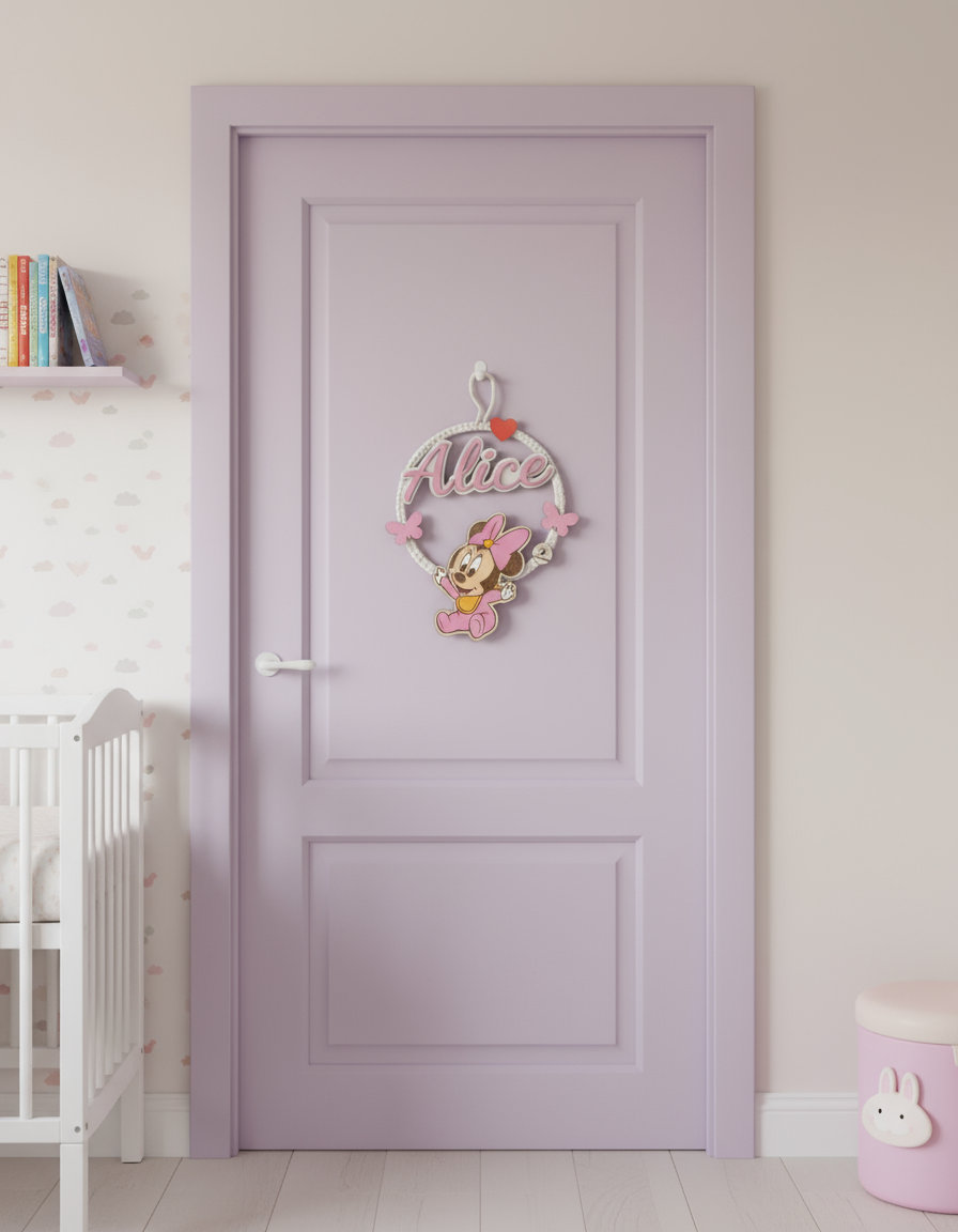 Una creazione artigianale unica e delicata, perfetta per dare il benvenuto a una nuova vita. Realizzato con corde in macramè 100% cotone e tag dipinto a mano con cura nei minimi dettagli, ispirato al dolce mondo di Minnie , simbolo di tenerezza, gioia e fantasia.Un fiocco nascita alternativo, elegante e originale, ideale da appendere alla porta della cameretta o da utilizzare come decorazione permanente per impreziosire lo spazio del neonato.