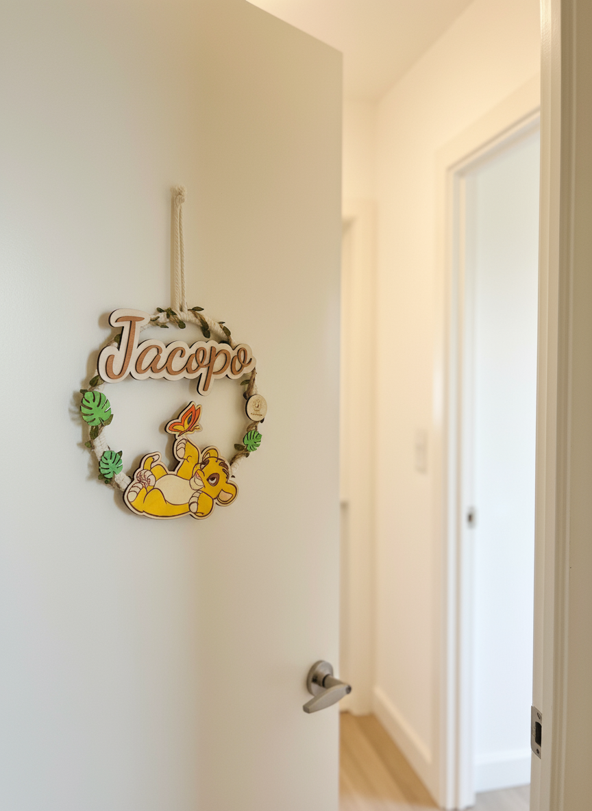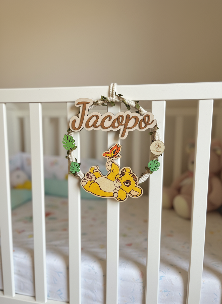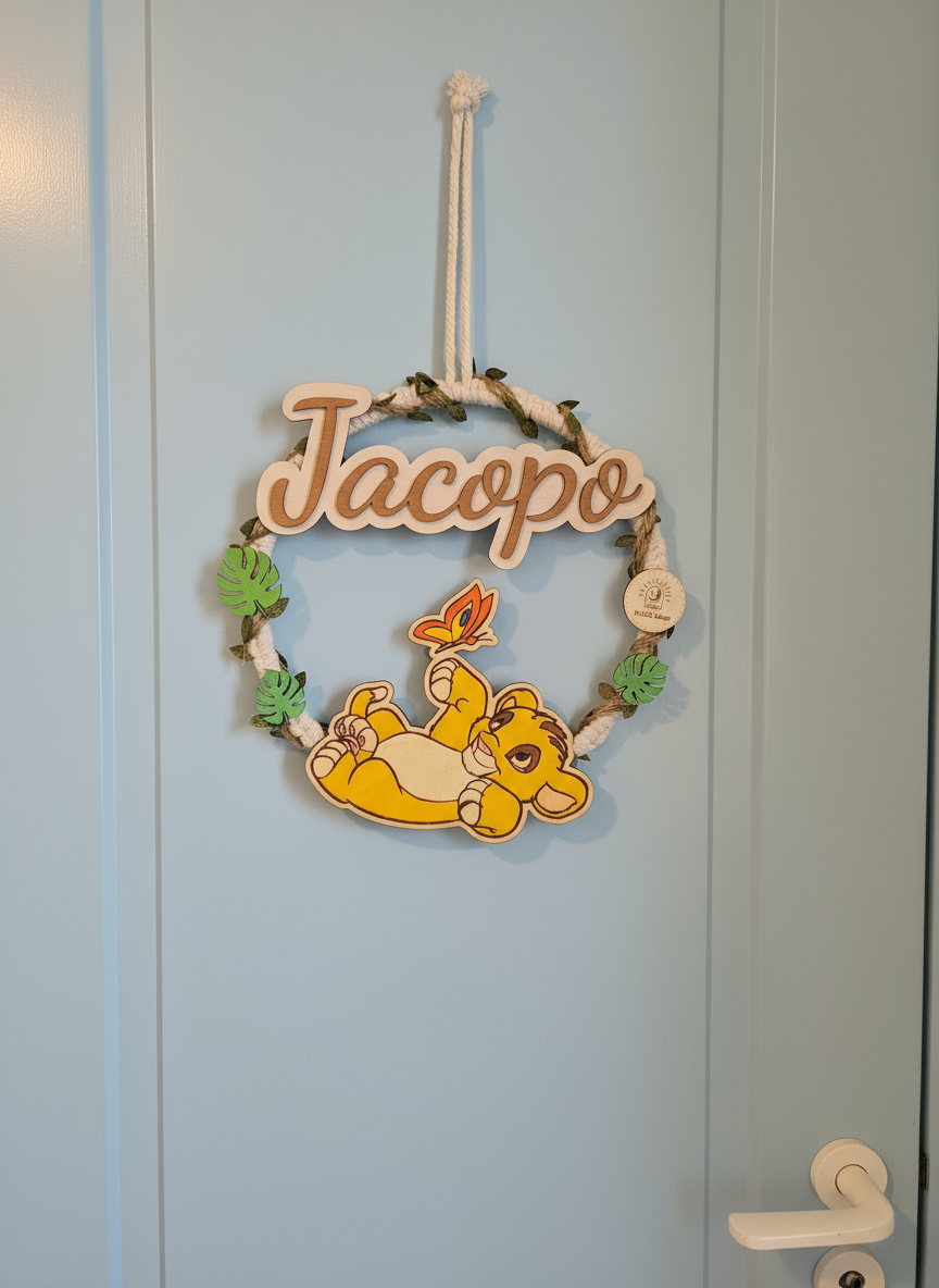 Una creazione unica e delicata, perfetta per accogliere una nuova vita. Il nostro cerchio nascita è realizzato con corde di macramè 100% cotone e in legno, dipinto a mano con cura nei minimi dettagli. È ispirato alla celebre fiaba del Re Leone, questo cerchio nascita è un tributo alla forza, al coraggio e alla bellezza della natura selvaggia. Il protagonista, Simba, ci insegna che ogni nuova vita è un viaggio, che inizia con il sogno di diventare chi siamo destinati a essere. Un fiocco nascita alternativo, elegante e originale, che può essere appeso alla porta della cameretta o come decorazione permanente della stanza del neonato.