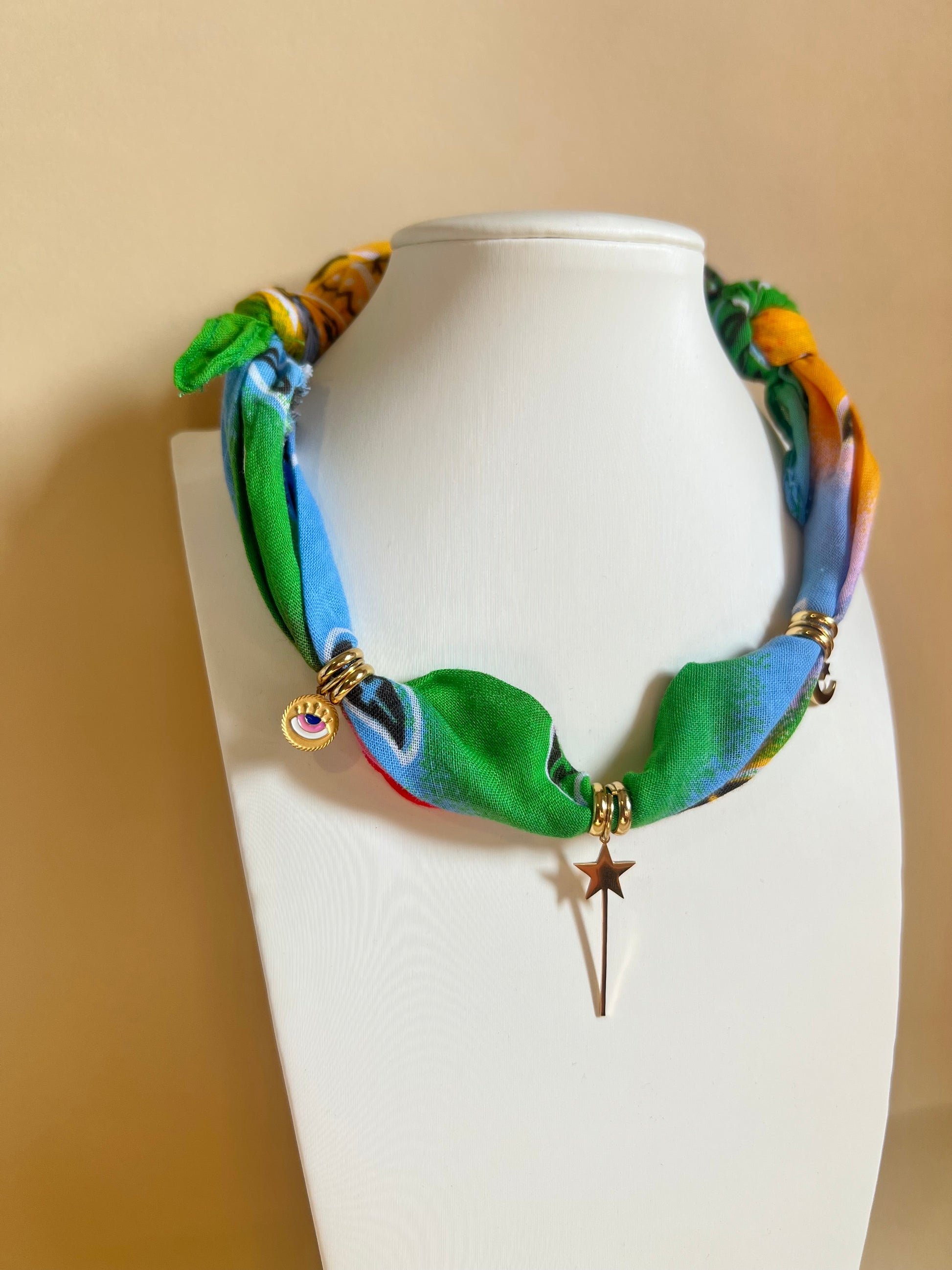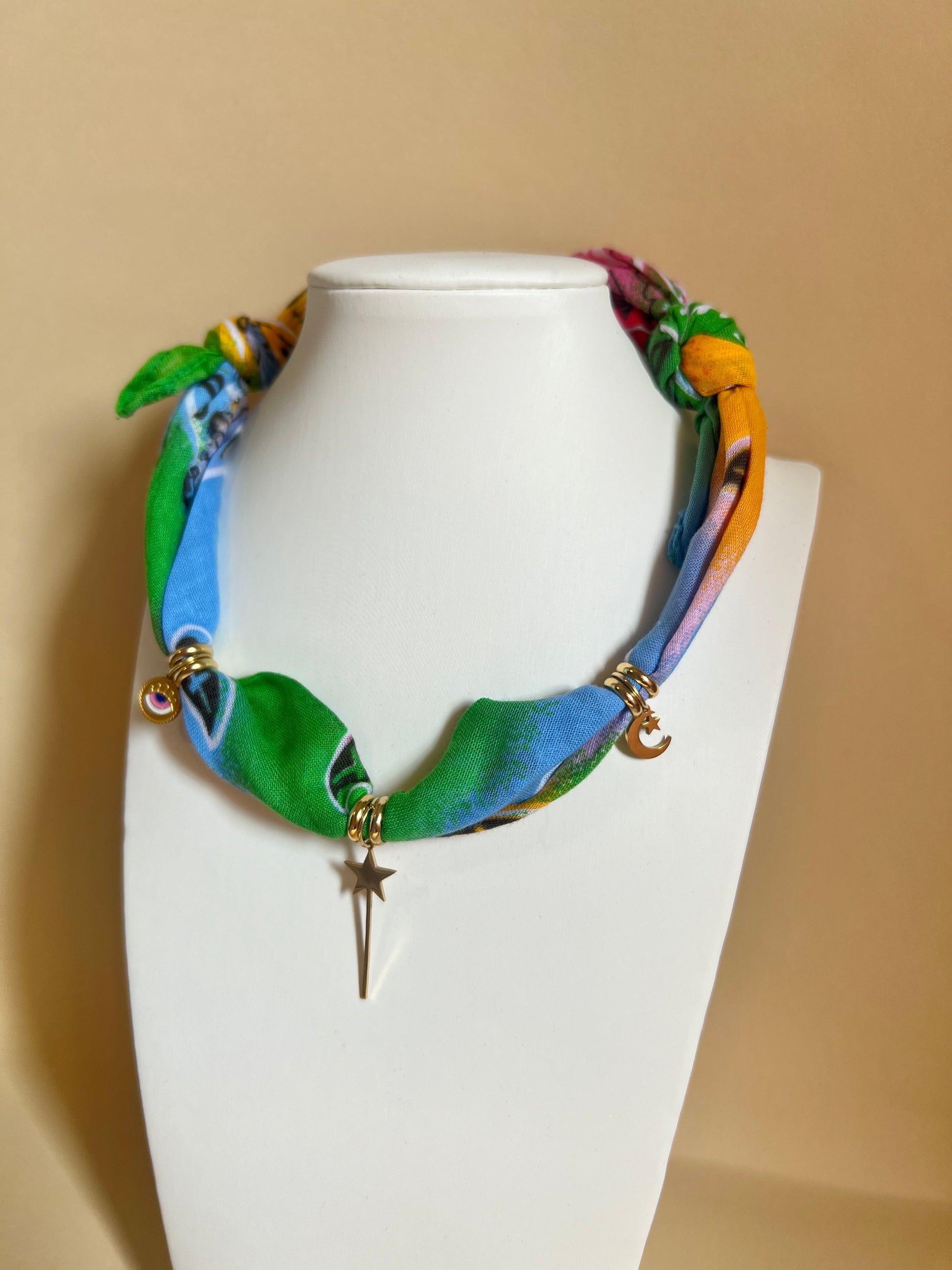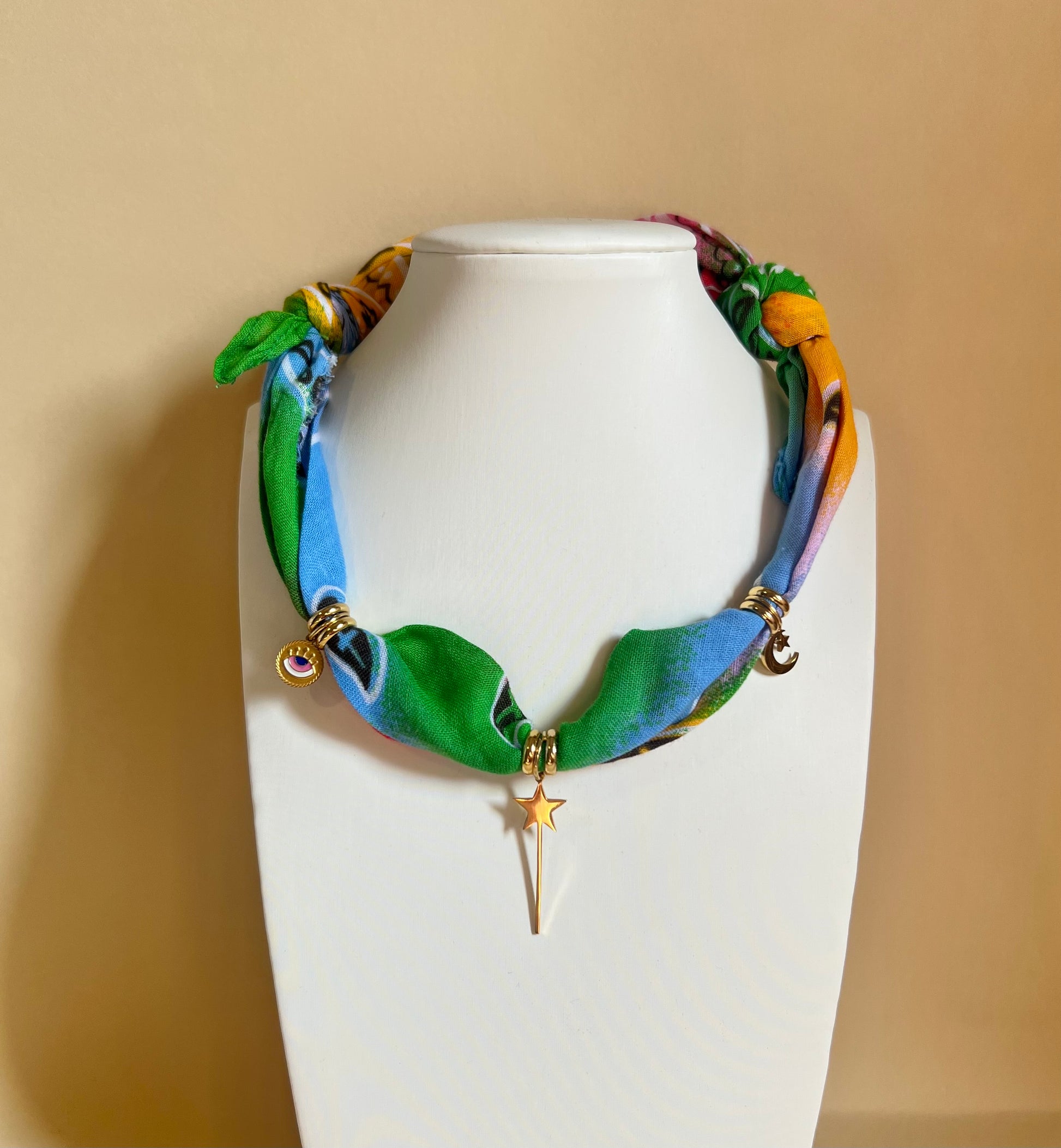 Realizzata con bandana dai colori vivaci, è impreziosita da charm simbolici in acciaio inossidabile: