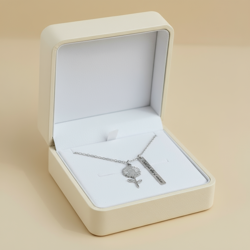 Un delicato girasole in acciaio inossidabile, simbolo di luce, positività, amore incondizionato, fedeltà, forza e resilienza accompagnato da una targhetta incisa.