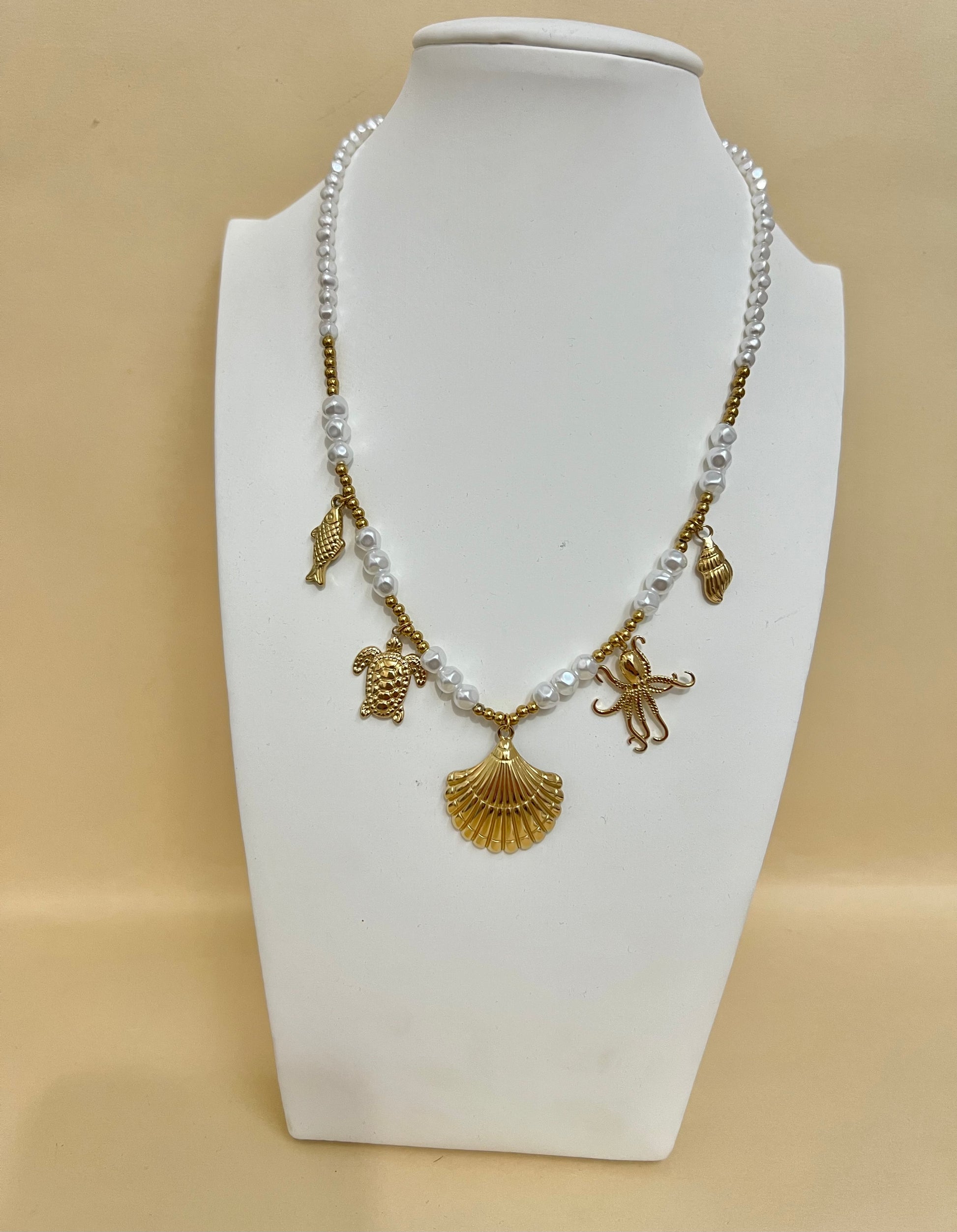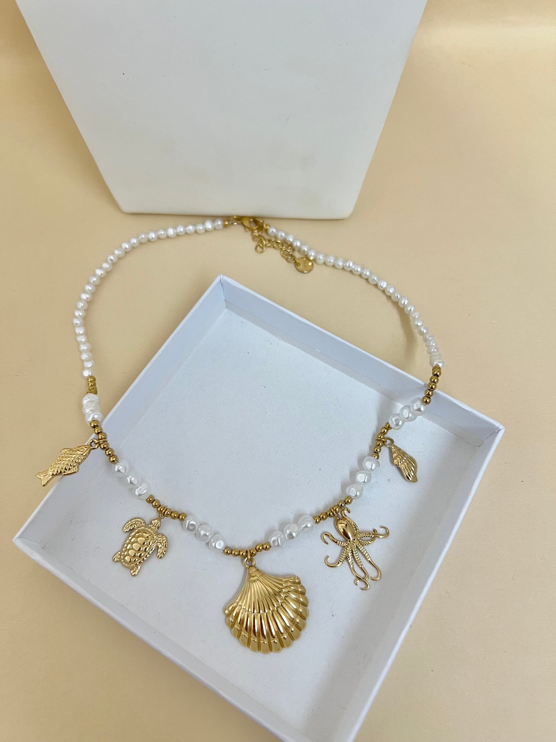 Collana “In fondo al mare” Un viaggio tra le meraviglie dell’oceano: catenina in acciaio inossidabile gold, impreziosita da perle bianche luminose e charm dorati che evocano la magia del mare.