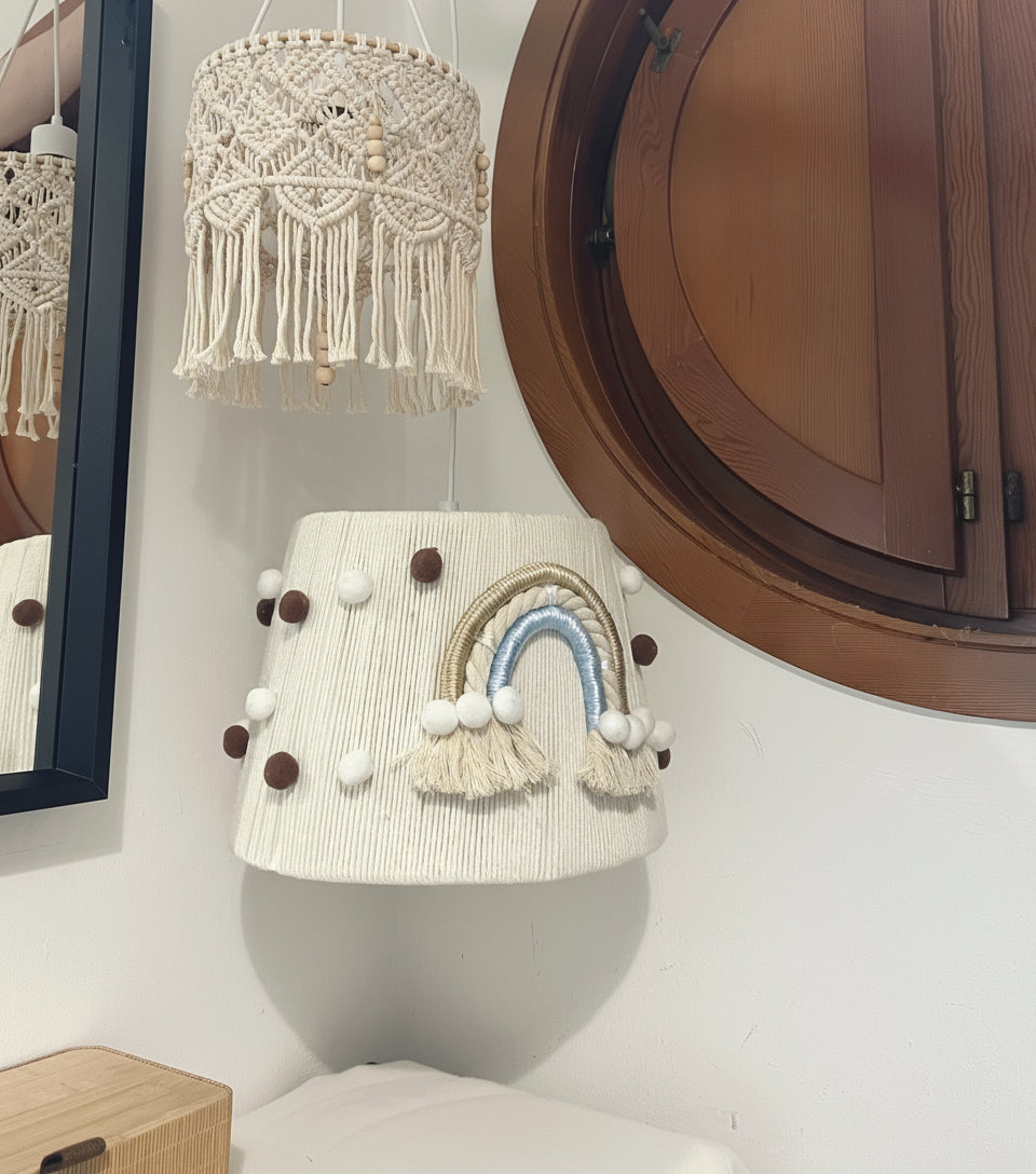 Lampada da soffitto in macramè 100% cotone, con maxi arcobaleni disposti su entrambi i lati della struttura, nelle delicate tonalità celeste, marrone e bianco. Completano il design i pon pon in lana 100% nei colori marrone e bianco.
