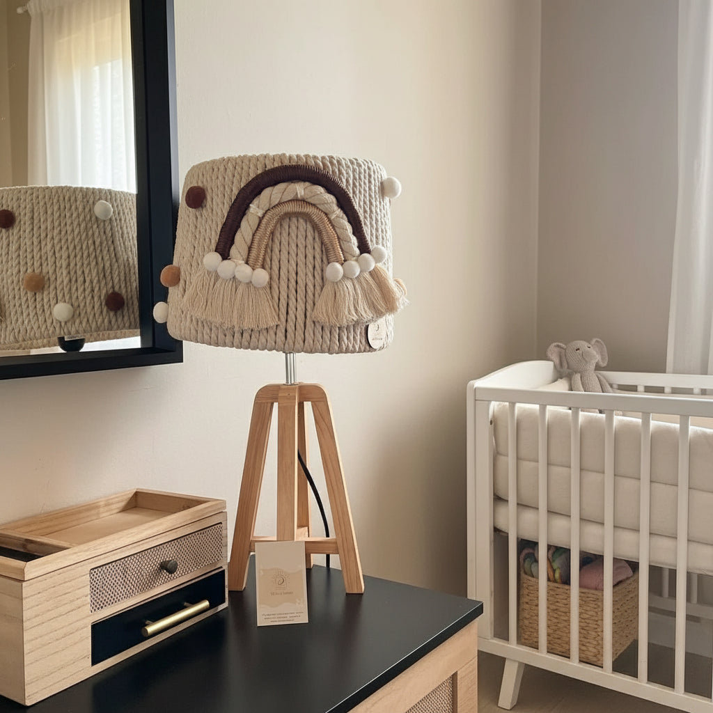 Lampada in macramè 100% cotone con base in legno e dettagli in arcobaleno di macramè, disponibile in colori neutri e pon pon in colore beige , bianco e marrone. Un'opera artigianale che aggiunge un tocco di eleganza e calore alla tua cameretta del tuo bambino.