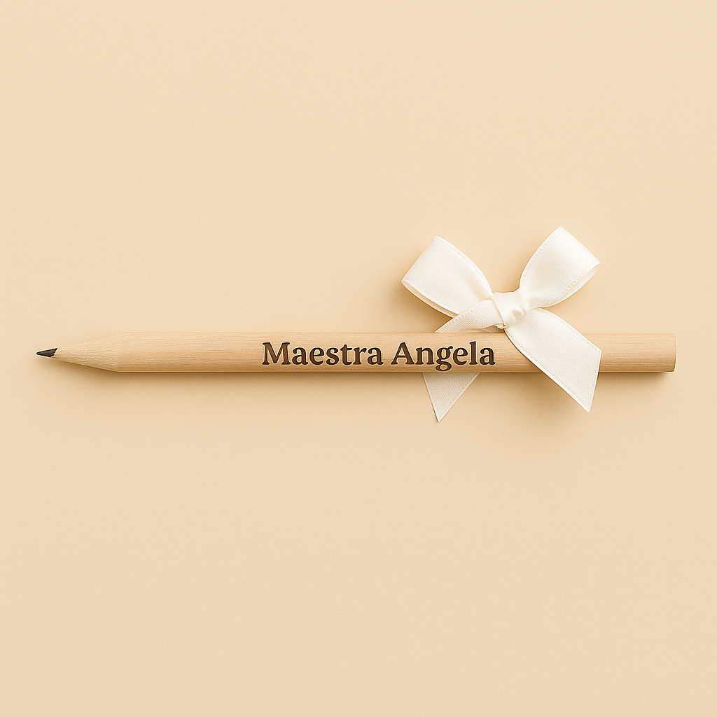 Una matita elegante e minimal, realizzata in legno naturale e personalizzata con incisione del nome dell’insegnante impreziosito da fiocco bianco.