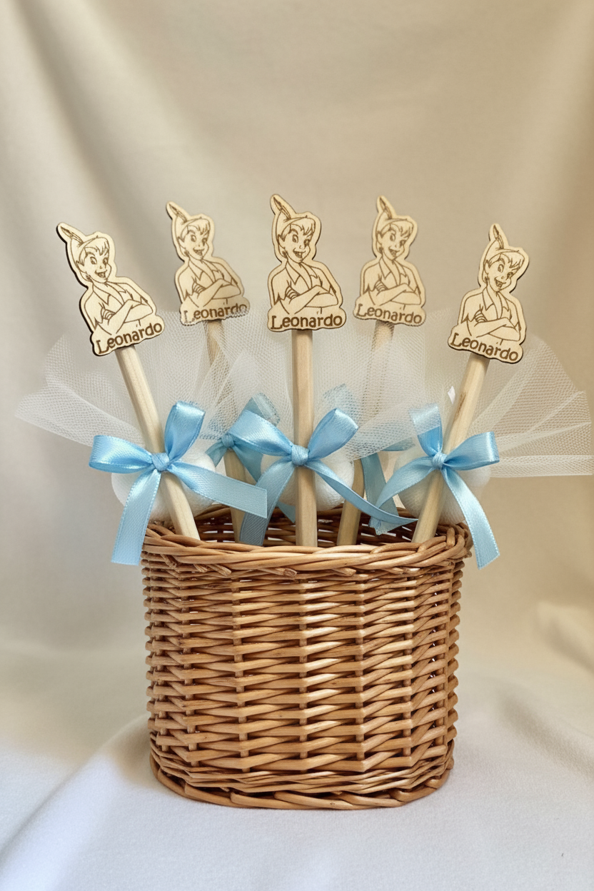 Matite in legno personalizzate con tag Peter Pan e incisione del nome del bambino. Ogni matita è arricchita da un ciuffo di tulle e confetti, rendendo il regalo ancora più speciale e unico!