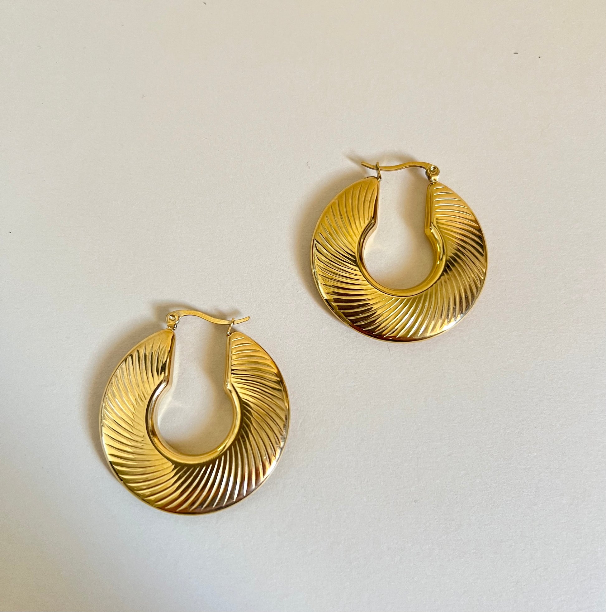 Orecchini a cerchio dorati in acciaio inossidabile, eleganti e luminosi, perfetti per donare un tocco di classe ad ogni look. Un accessorio che cattura la luce e valorizza il viso con semplicità e raffinatezza.