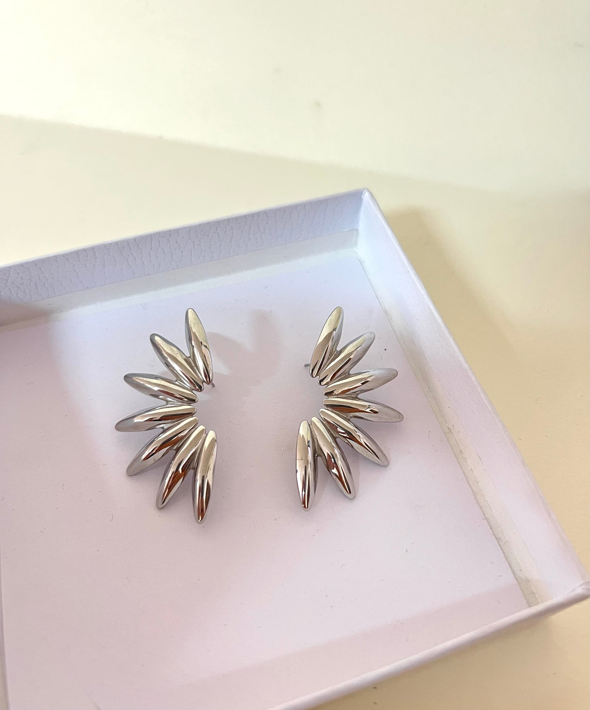 Orecchini “Raggio” silver in acciaio inossidabile, eleganti e luminosi, perfetti per donare un tocco di classe ad ogni look.
