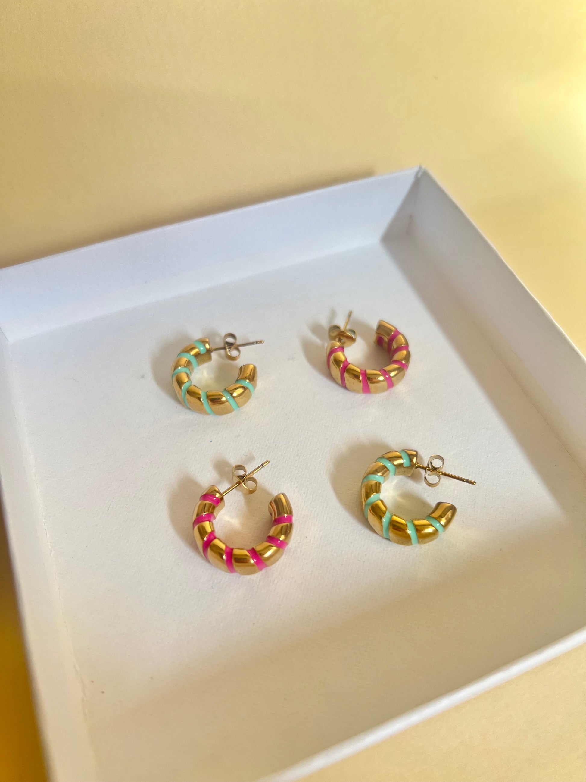 Orecchini ”Satori” in acciaio inossidabile in colorazione gold impreziositi da spirale in colore fucsia o verde acqua