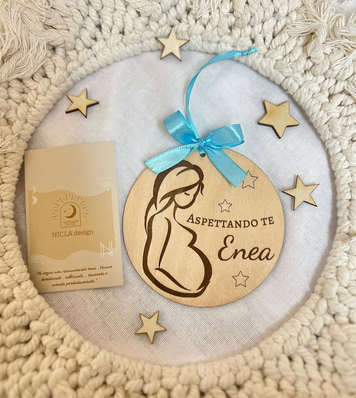 Sfera di Natale personalizzata con la scritta “Aspettando ”, il nome del bambino o della bambina. Un ricordo prezioso per celebrare un momento unico e rendere ancora più speciale il vostro albero di Natale.