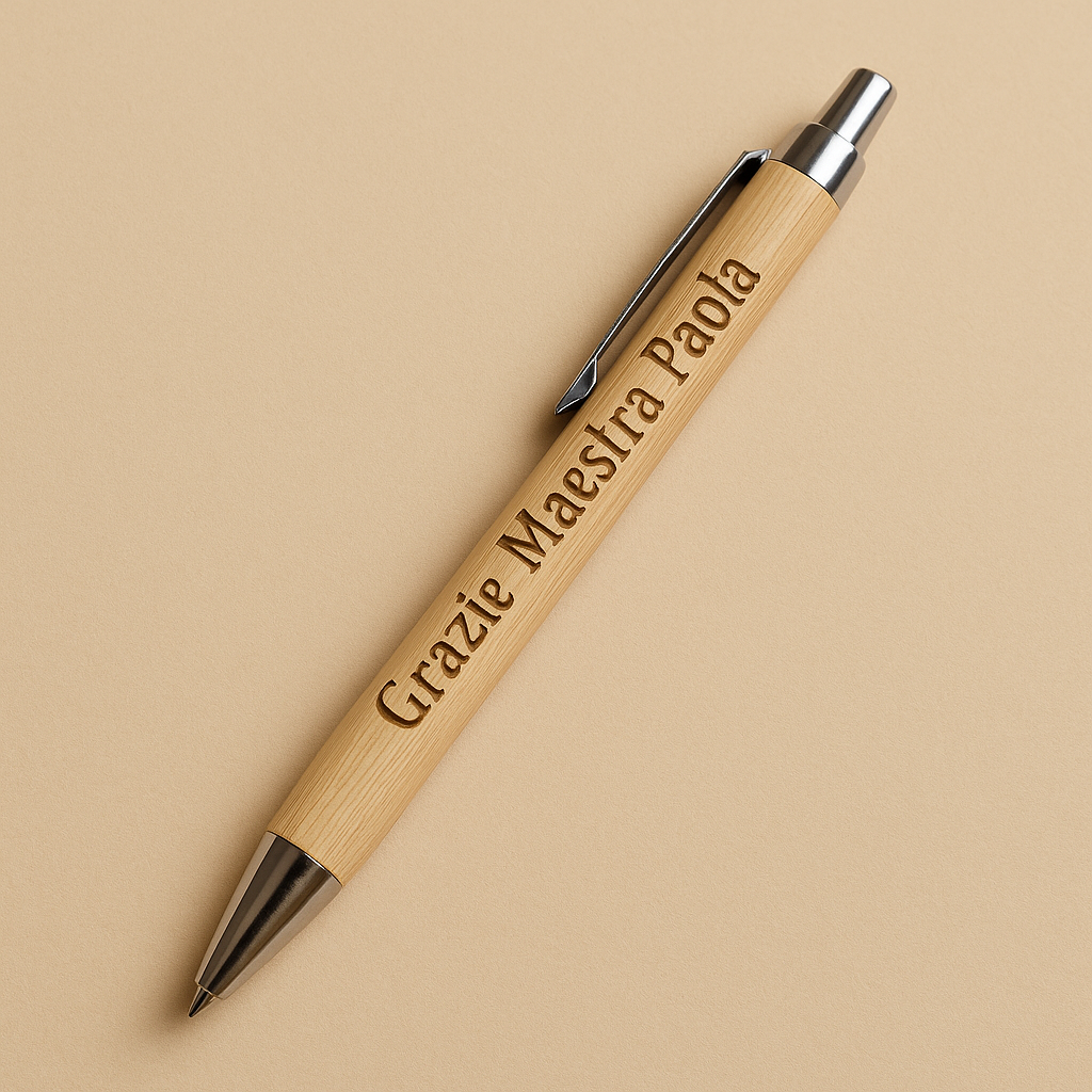 Elegante penna in bambù naturale con incisione personalizzata, perfetta come pensiero di fine anno per le maestre. Un regalo unico, utile e sostenibile, che unisce semplicità e significato. Disponibile con il nome dell’insegnante inciso per rendere ogni pezzo speciale.