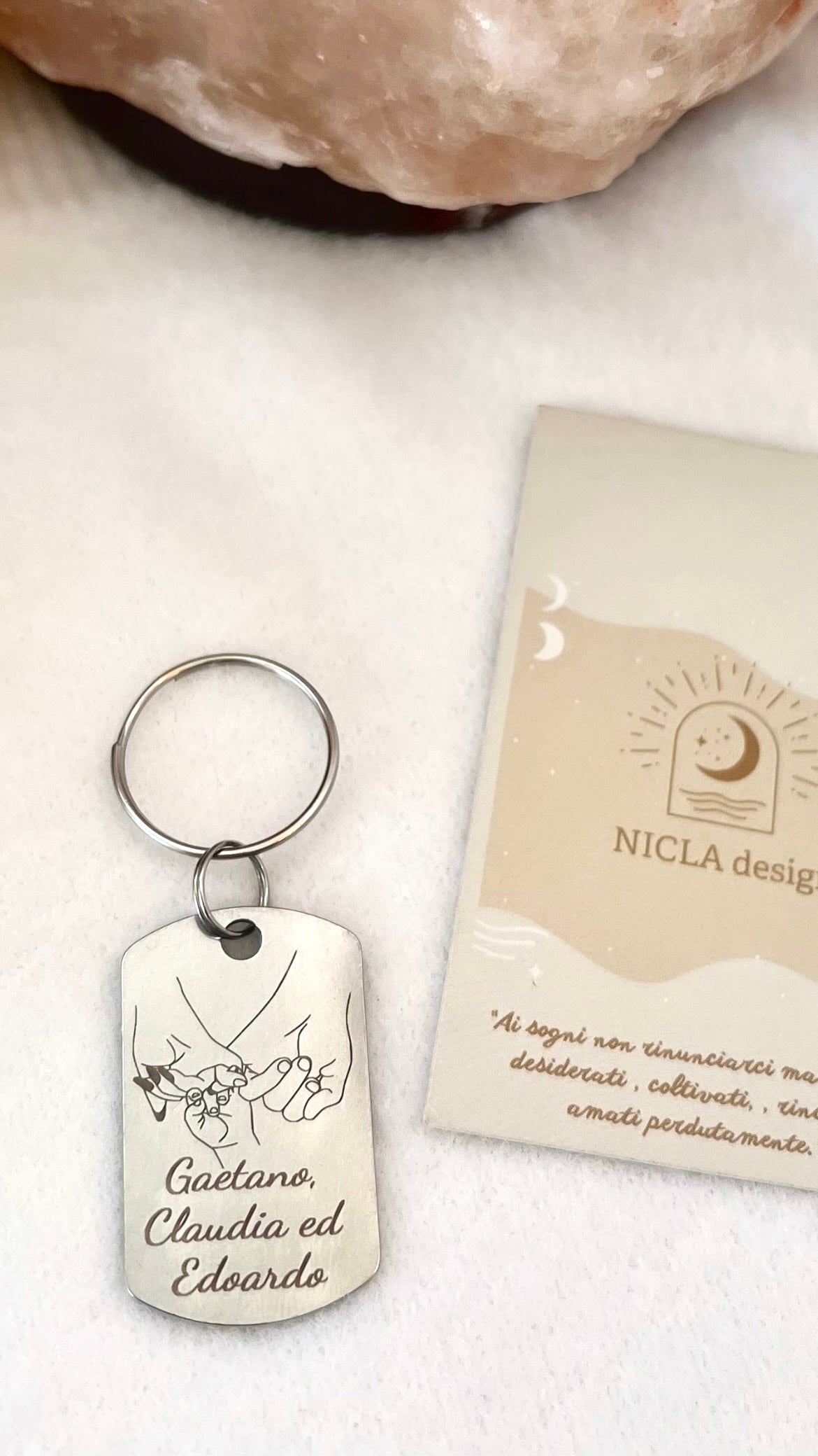 Portachiavi in acciaio inossidabile con una grafica che rappresenta le mani di una famiglia: mamma, papà e figlio/a.