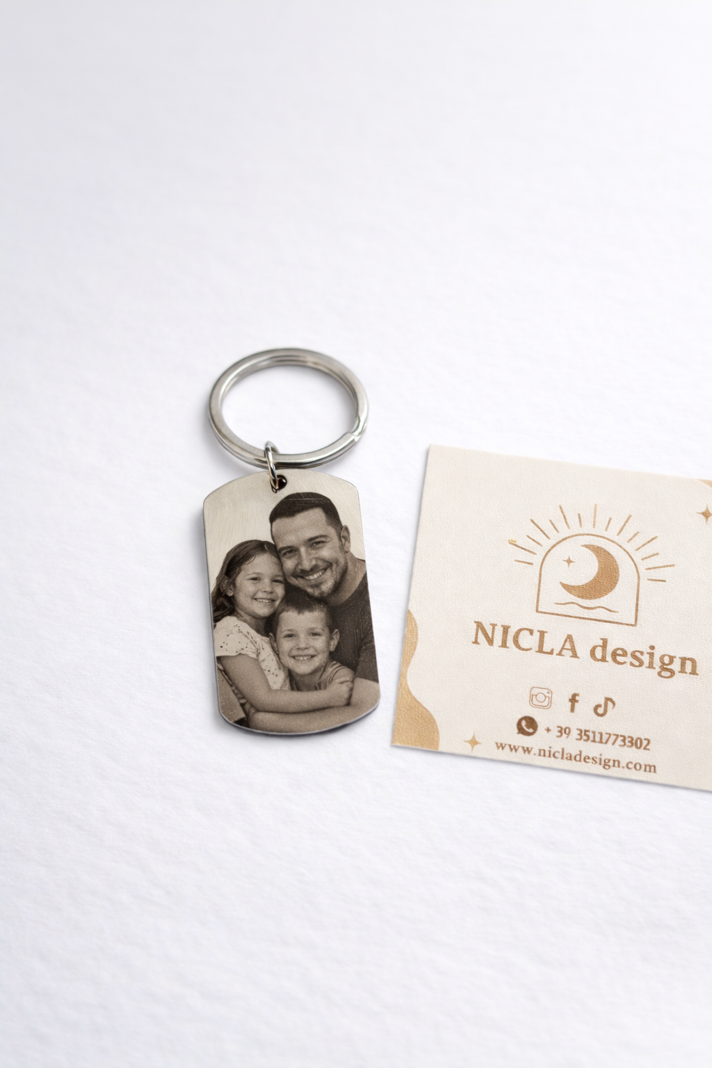 Portachiavi in acciaio stile militare con incisione personalizzata della foto dei figli o del papà con i figli. Un’idea regalo emozionante e indelebile da portare sempre con sé.