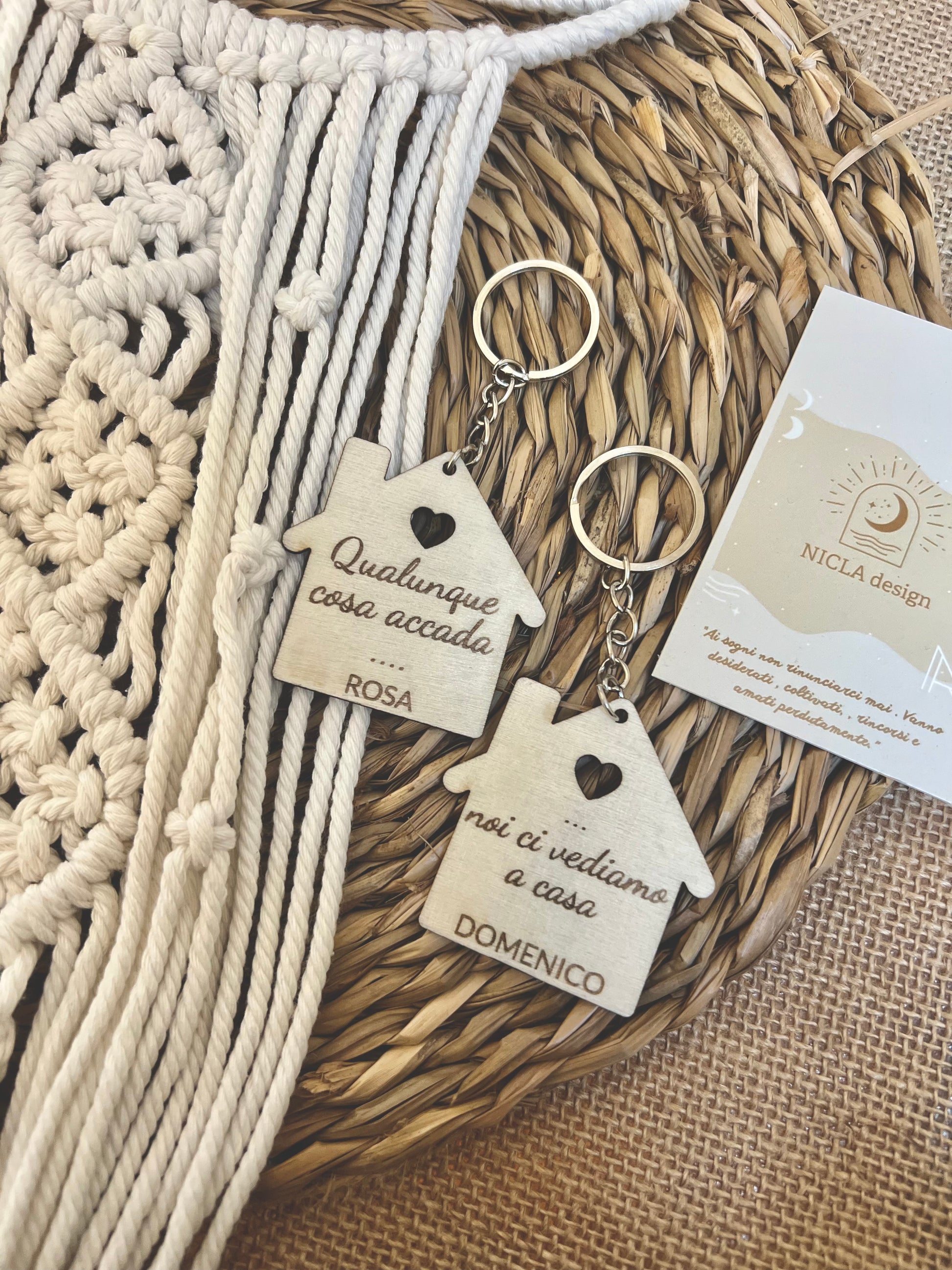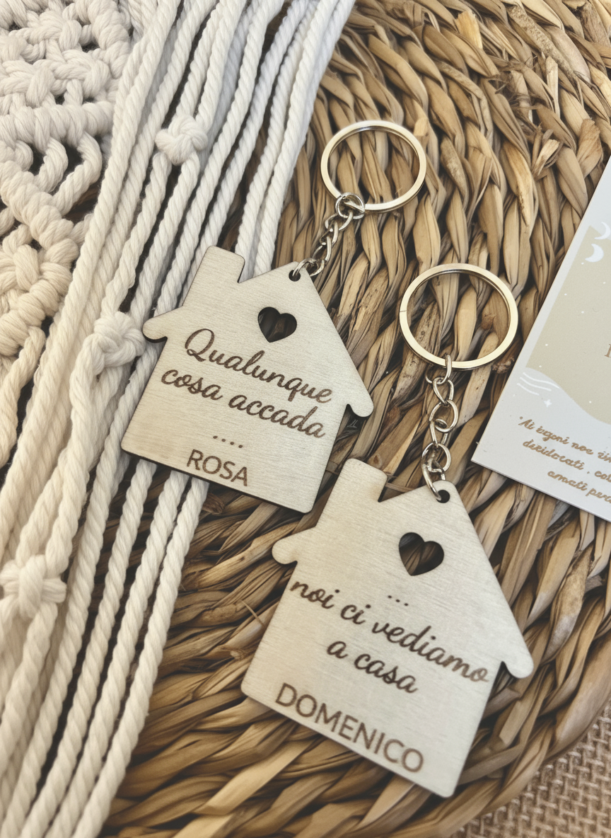 Coppia di portachiavi in legno a forma di casa, con frase personalizzabile e nomi.
