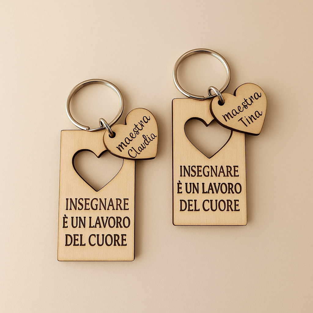 Un portachiavi dal significato profondo, realizzato in legno e inciso con la frase “Insegnare è un lavoro del cuore”. Il cuore intagliato e il ciondolo personalizzabile con il nome della maestra rendono questo regalo unico e speciale.
