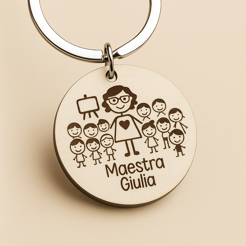 Portachiavi personalizzato in legno con incisisione di una dolce grafica della maestra circondata dai suoi alunni. Un pensiero speciale per dire “Grazie Maestra” in modo unico e affettuoso. Perfetto come regalo di fine anno scolastico.