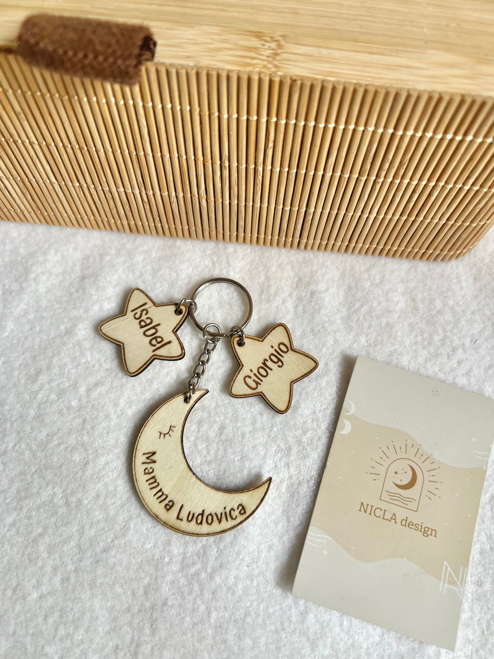 Portachiavi in legno con incisione personalizzata, raffigurante una mamma luna e per ogni stella un figlio.