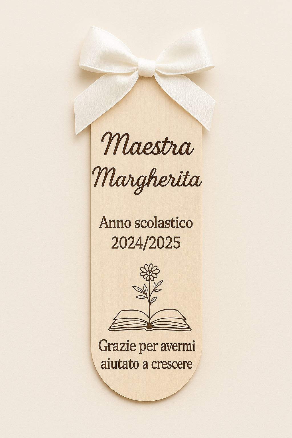 Un raffinato segnalibro in legno naturale con fiocco in raso e incisione personalizzata. Perfetto come regalo di fine anno scolastico, è decorato con una grafica elegante e una frase che celebra l’importanza dell’insegnamento.