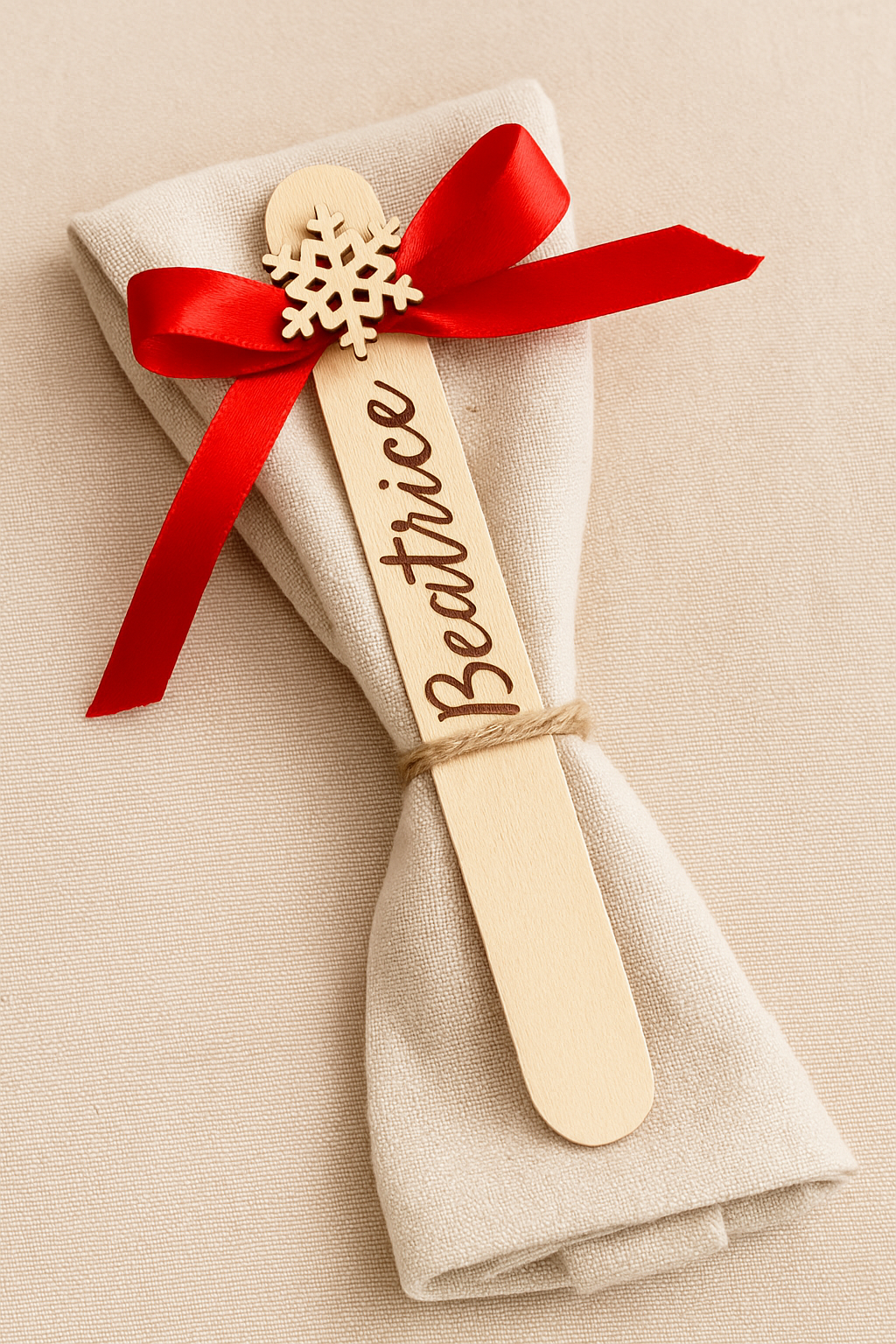 Aggiungi un tocco unico ed elegante alla tua tavola con i nostri bastoncini in legno personalizzati, incisi con il nome dei tuoi invitati. Perfetti per Natale, matrimoni, battesimi o eventi speciali, questi segnaposto uniscono semplicità, calore e artigianalità. Realizzati in legno naturale e incisi al laser, possono essere completati con un fiocco del colore a scelta per abbinarsi al tema del tuo evento. Inoltre, è disponibile l’opzione di aggiungere un tag a forma di fiocco di neve, per un tocco natalizio ancora più speciale.