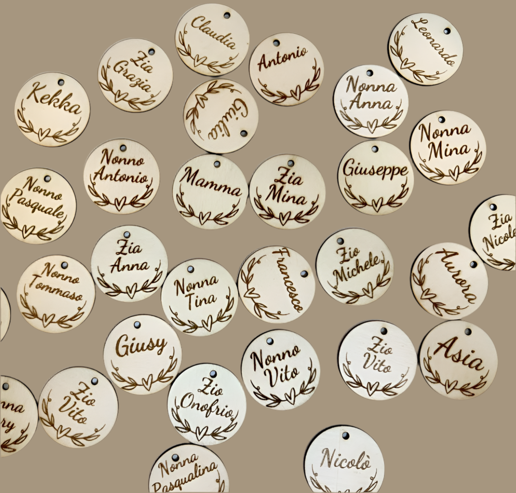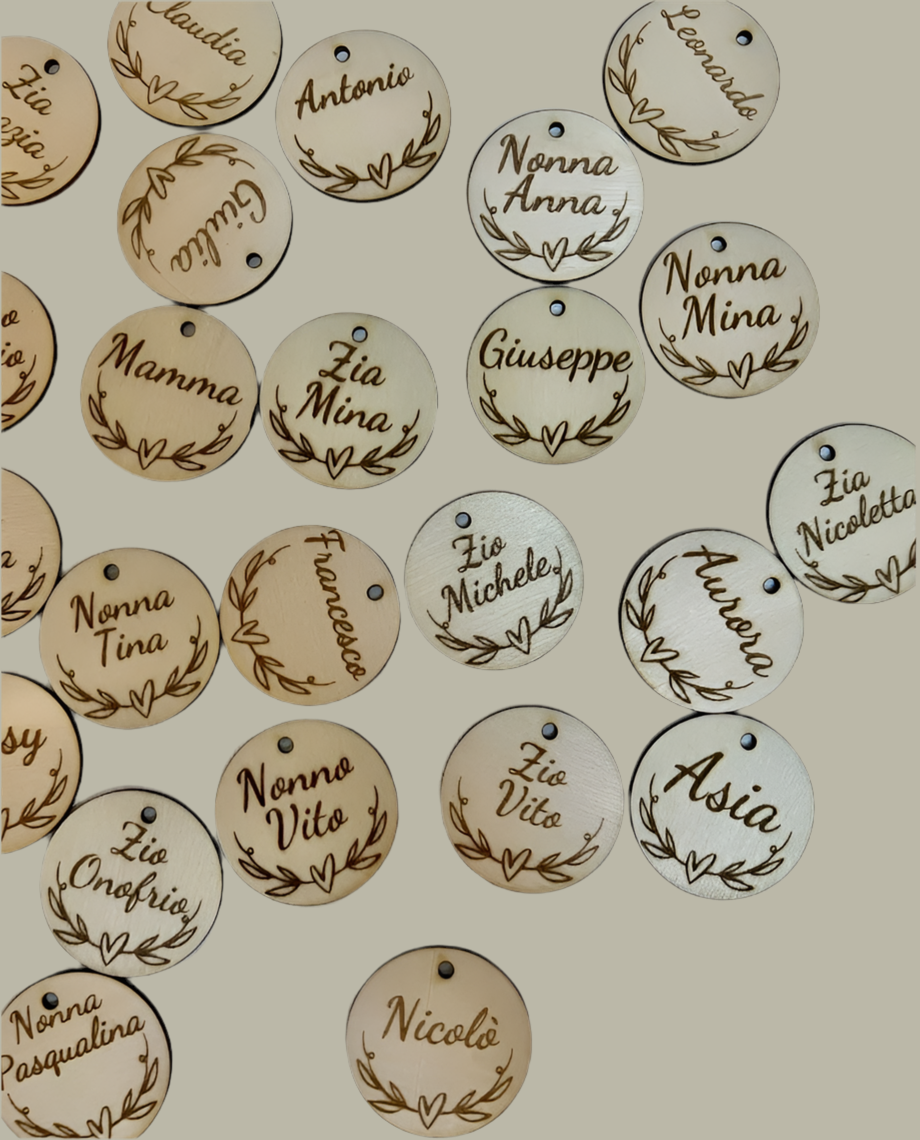 Rendi la tua tavola di Natale ancora più speciale con i nostri segnaposto ovali, realizzati con cura e incisi con il nome dei tuoi invitati e una grafica che raffigura una coroncina di foglie con un cuore centrale . Un dettaglio elegante e personalizzato che donerà un tocco unico al tuo evento natalizio.