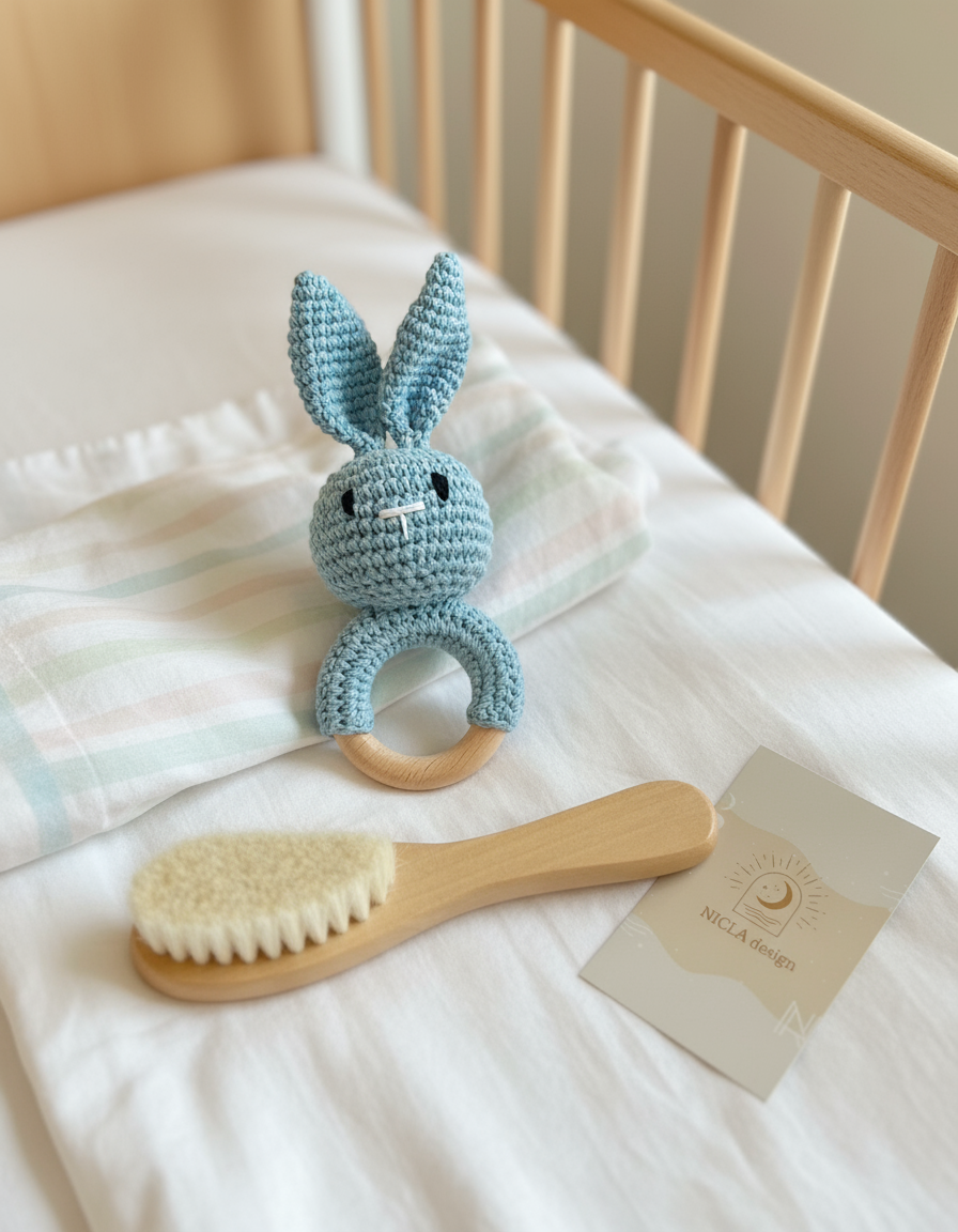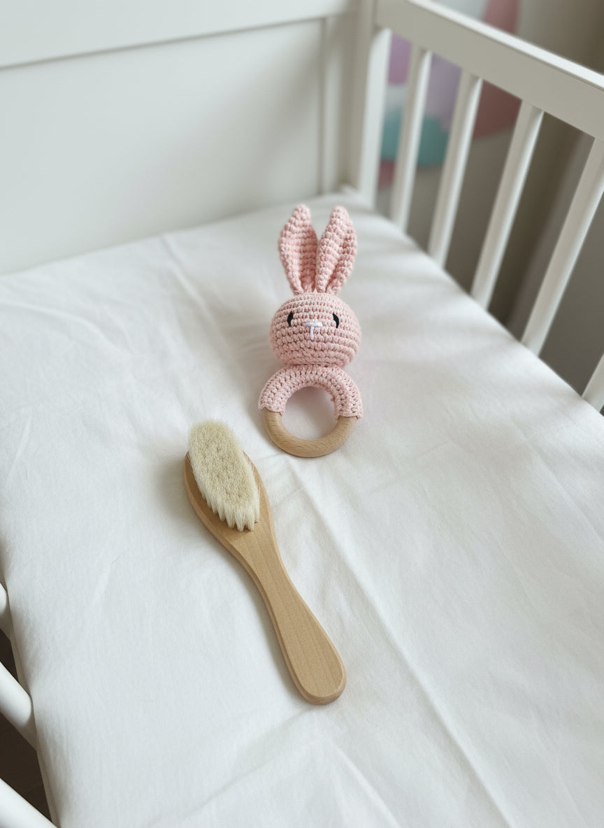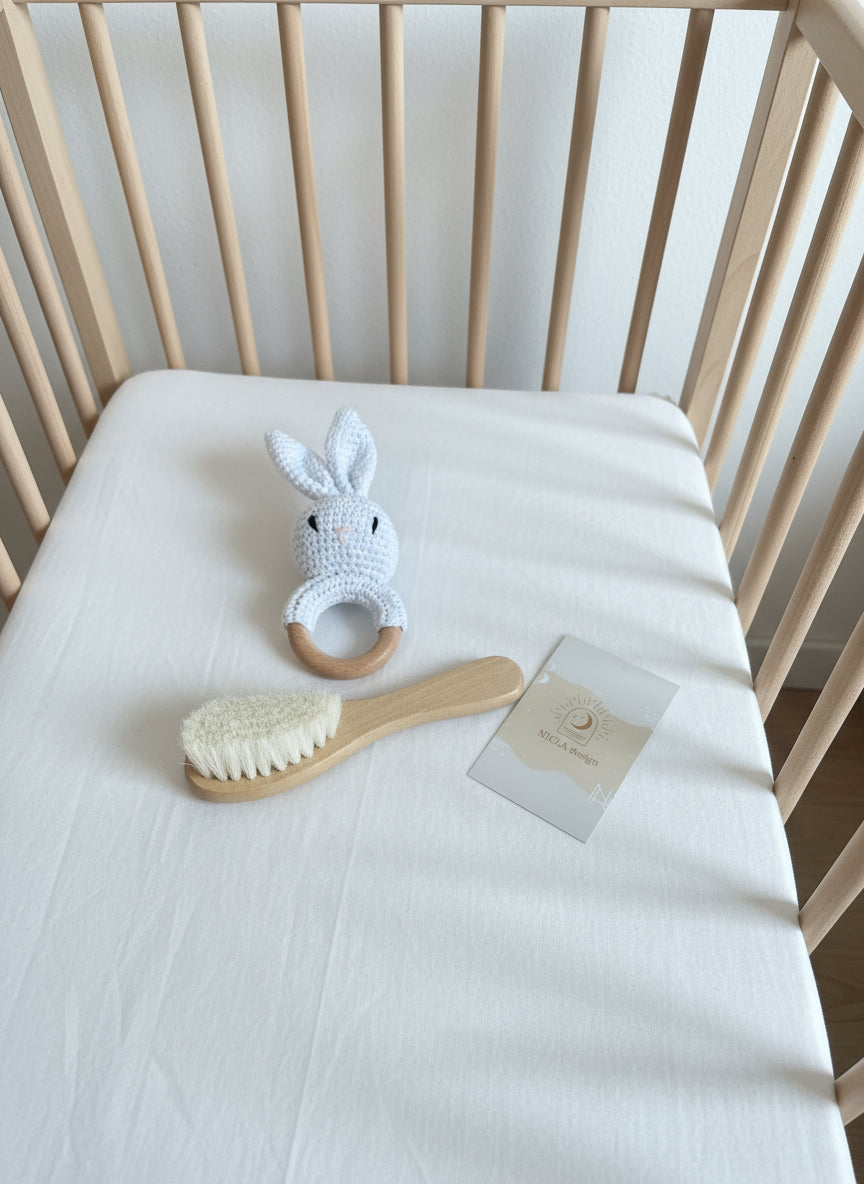 Il set coniglietto include un sonaglio ad uncinetto con incisione del nome del tuo bambino, una spazzola in setole 100% pelo di capra con incisione personalizzata del nome.