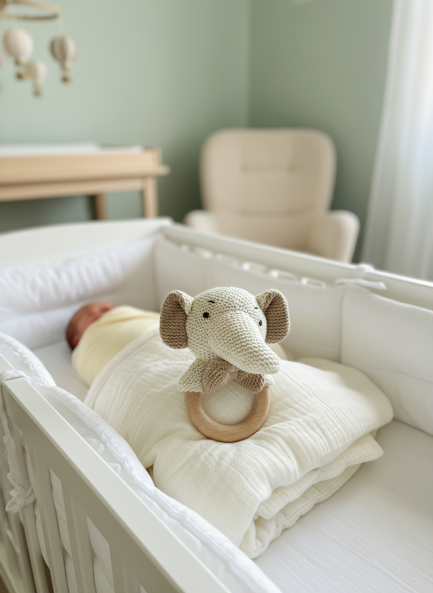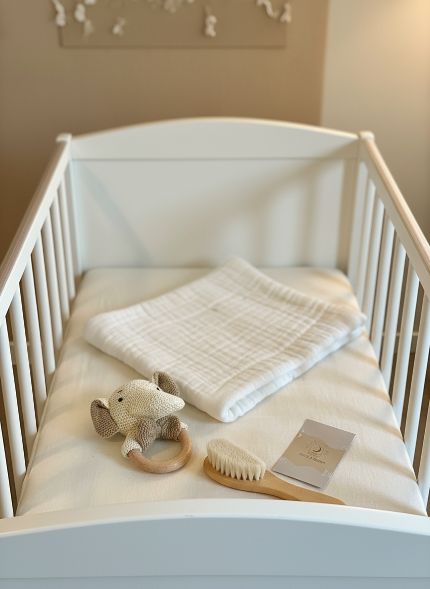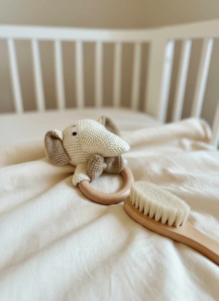Il set elefantino beige include un sonaglio ad uncinetto con incisione del nome del tuo bambino, una spazzola in setole 100% pelo di capra con incisione personalizzata del nome.