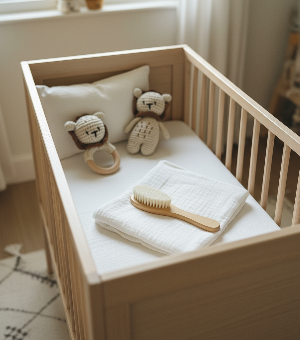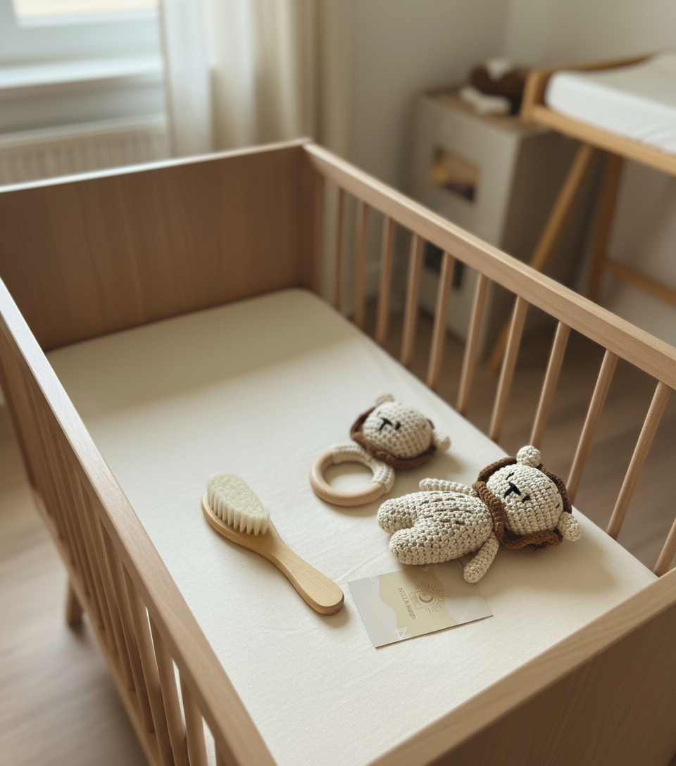 Il set leoncino include un sonaglio ad uncinetto con incisione del nome del tuo bambino, una spazzola in setole 100% pelo di capra con incisione personalizzata del nome e un pupazzo ad uncinetto, realizzato artigianalmente a mano.