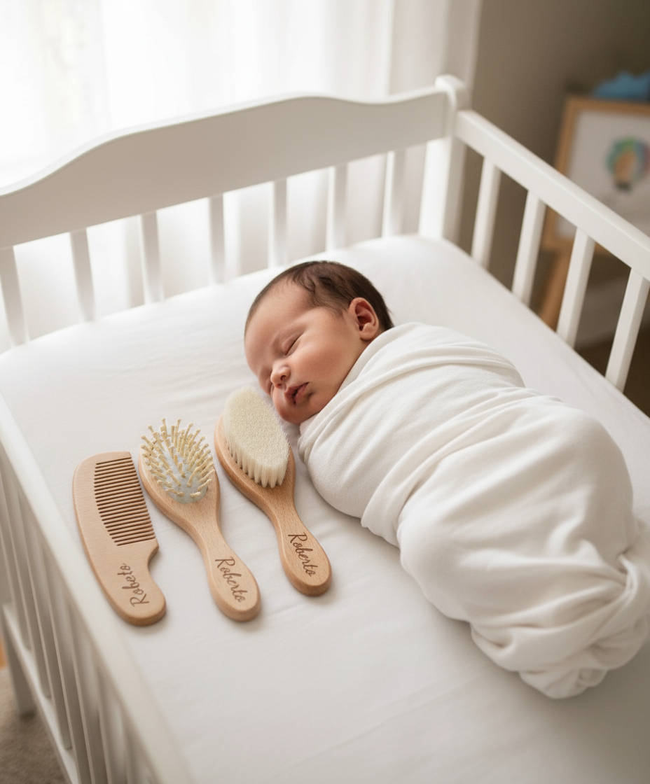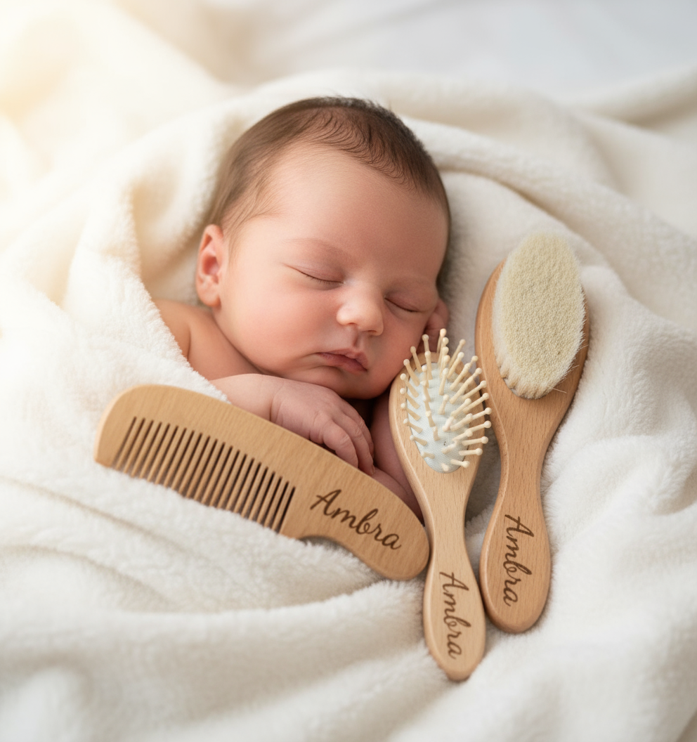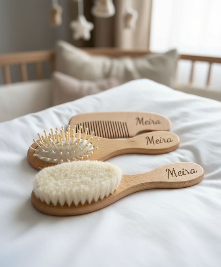 Set di tre spazzole in legno di faggio e setole 100% in pelo di capra, personalizzabili con l'incisione del nome del tuo bambino. Un regalo delicato e unico per la cura dei più piccoli.