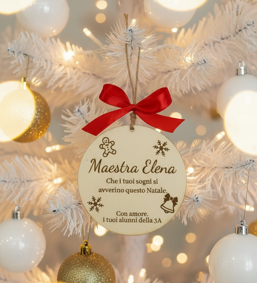 Sfera di Natale personalizzata – Ringraziamento maestra .Un pensiero speciale per dire “grazie” a chi ha accompagnato con dolcezza e dedizione un anno importante.Un ricordo prezioso da appendere all’albero, personalizzato con il nome della maestra e l’anno, per custodire nel tempo un legame unico.