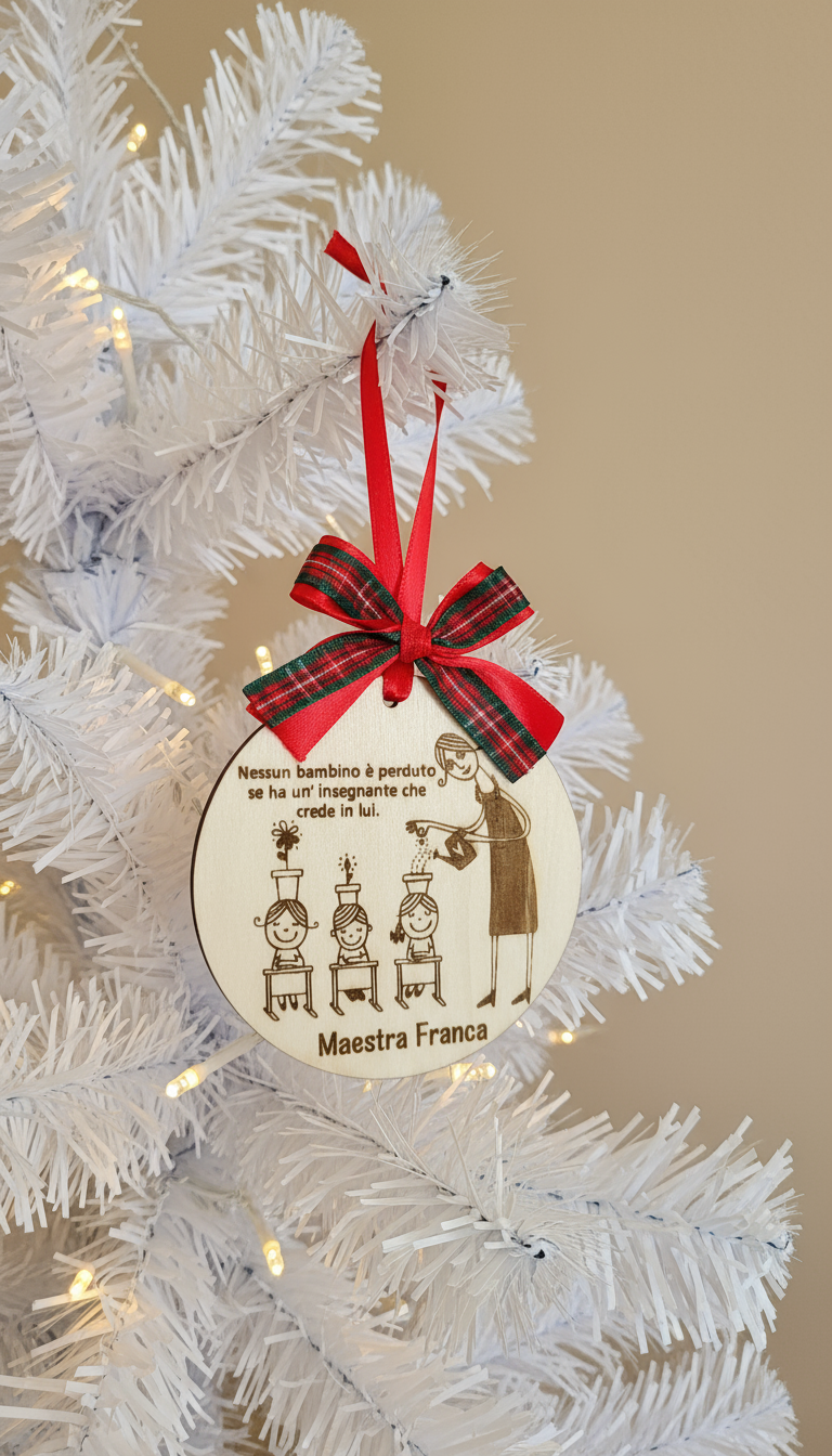 Sfera di Natale personalizzata – Ringraziamento maestra .Un pensiero speciale per dire “grazie” a chi ha accompagnato con dolcezza e dedizione un anno importante.Un ricordo prezioso da appendere all’albero, personalizzato con il nome della maestra e l’anno, per custodire nel tempo un legame unico.