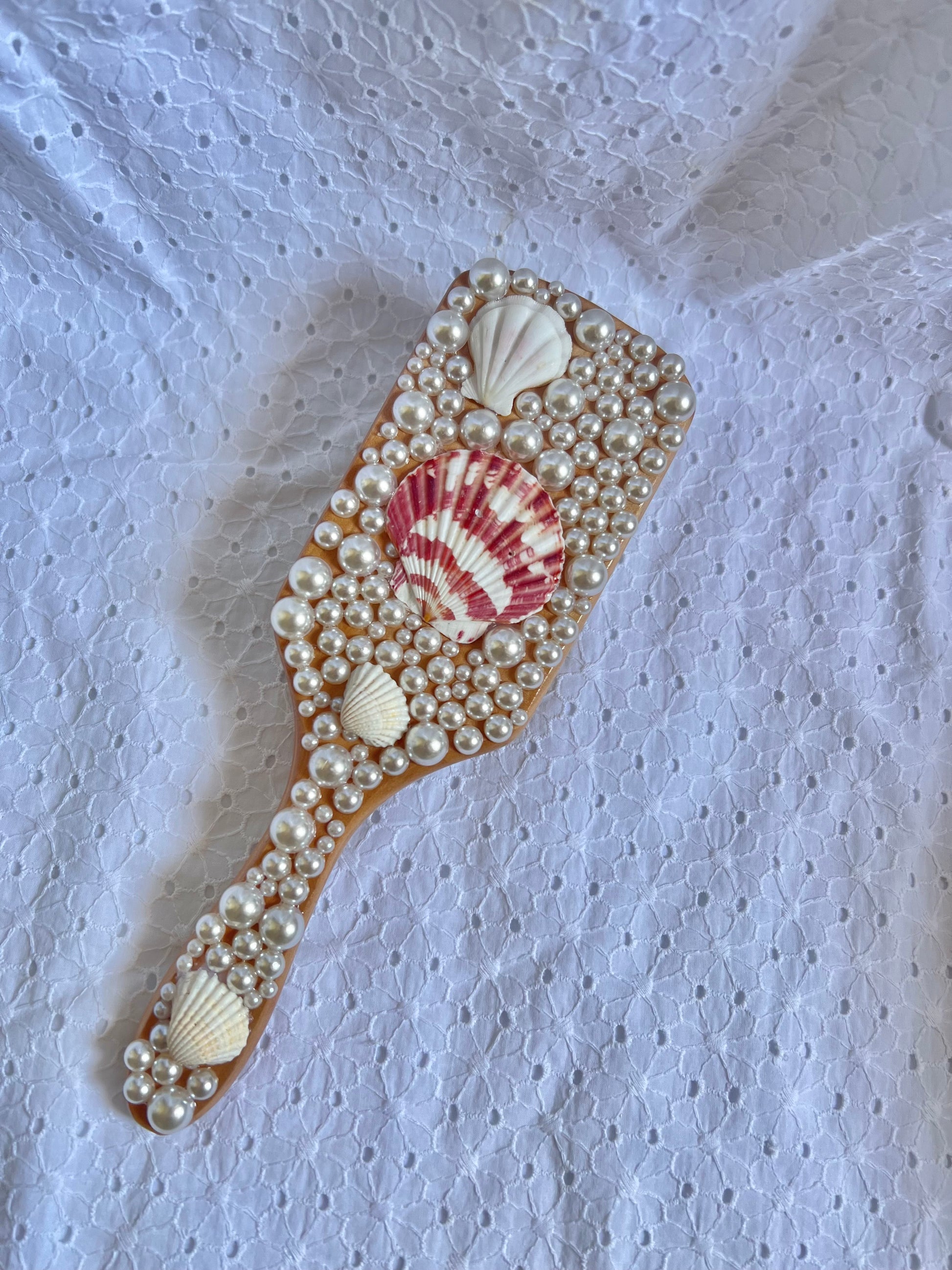 Elegante spazzola in legno decorata a mano con vere conchiglie e perle effetto madreperla, perfetta per chi ama distinguersi con stile anche nei piccoli dettagli. Ogni pezzo è unico e curato nei minimi particolari, ispirato alla magia dell’estate e alla bellezza del mare.