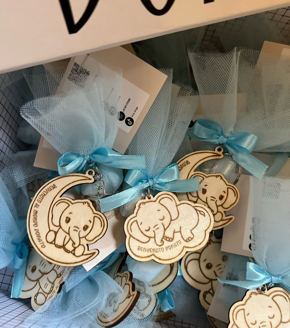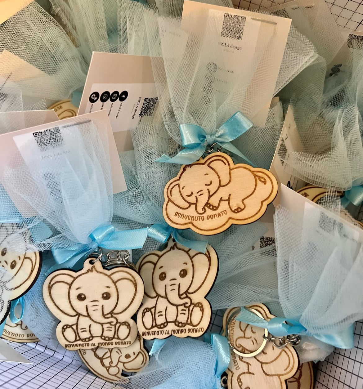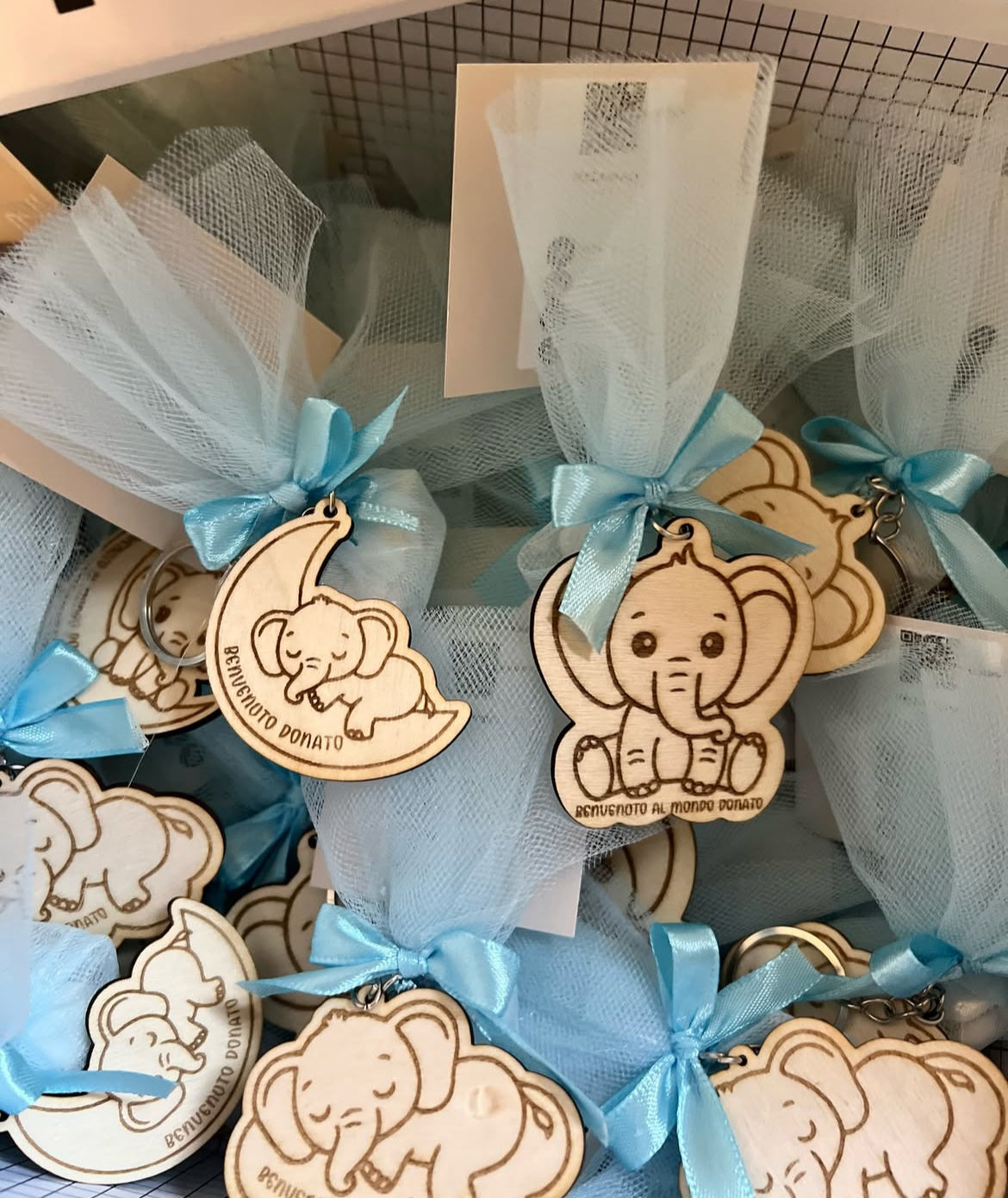 Dolcissimi tag in legno con sagoma di elefantino, perfetti per dare il benvenuto al tuo bimbo o alla tua bimba. Personalizzabili con frasi come “Benvenuto al mondo…” o “Benvenuta…”, sono disponibili in 5 grafiche diverse di elefantino, tutte tenere e originali.Ogni tag è completo di tulle e confetti, ideale per bomboniere nascita.PER PERSONALIZZARE AGGIUNGI L’ARTICOLO AL CARRELLO E TROVERAI LA SEZIONE “ISTRUZIONI SPECIALI PER L’ORDINE” DOVE CI POTRAI INSERIRE IL NOME DA INCIDERE