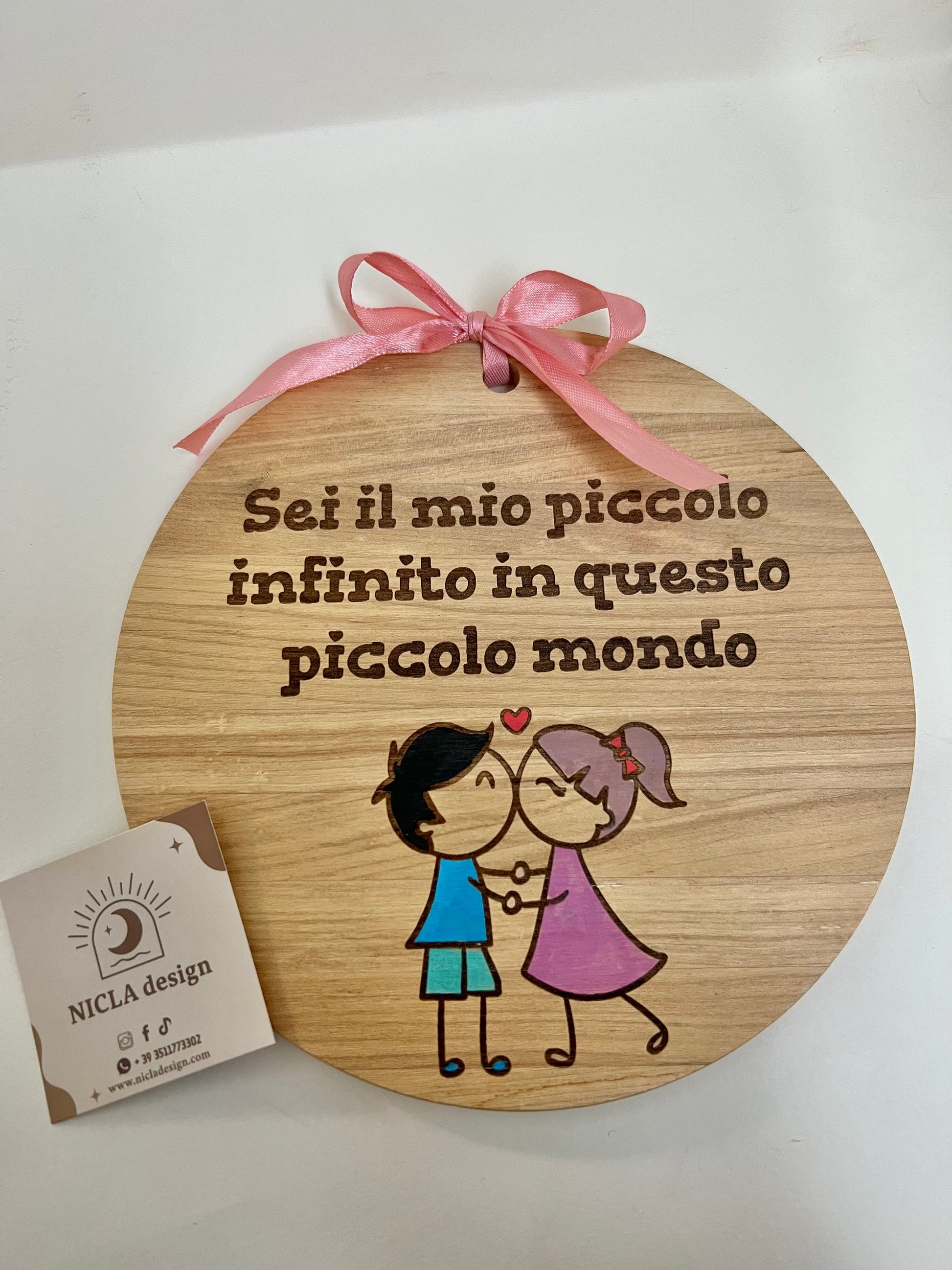 Tagliere circolare personalizzato con la frase “Sei il mio piccolo mondo in questo piccolo infinito” con grafica colorata .Una creazione unica, impreziosita da una grafica colorata, perfetta per esprimere amore e dolcezza in ogni dettaglio.